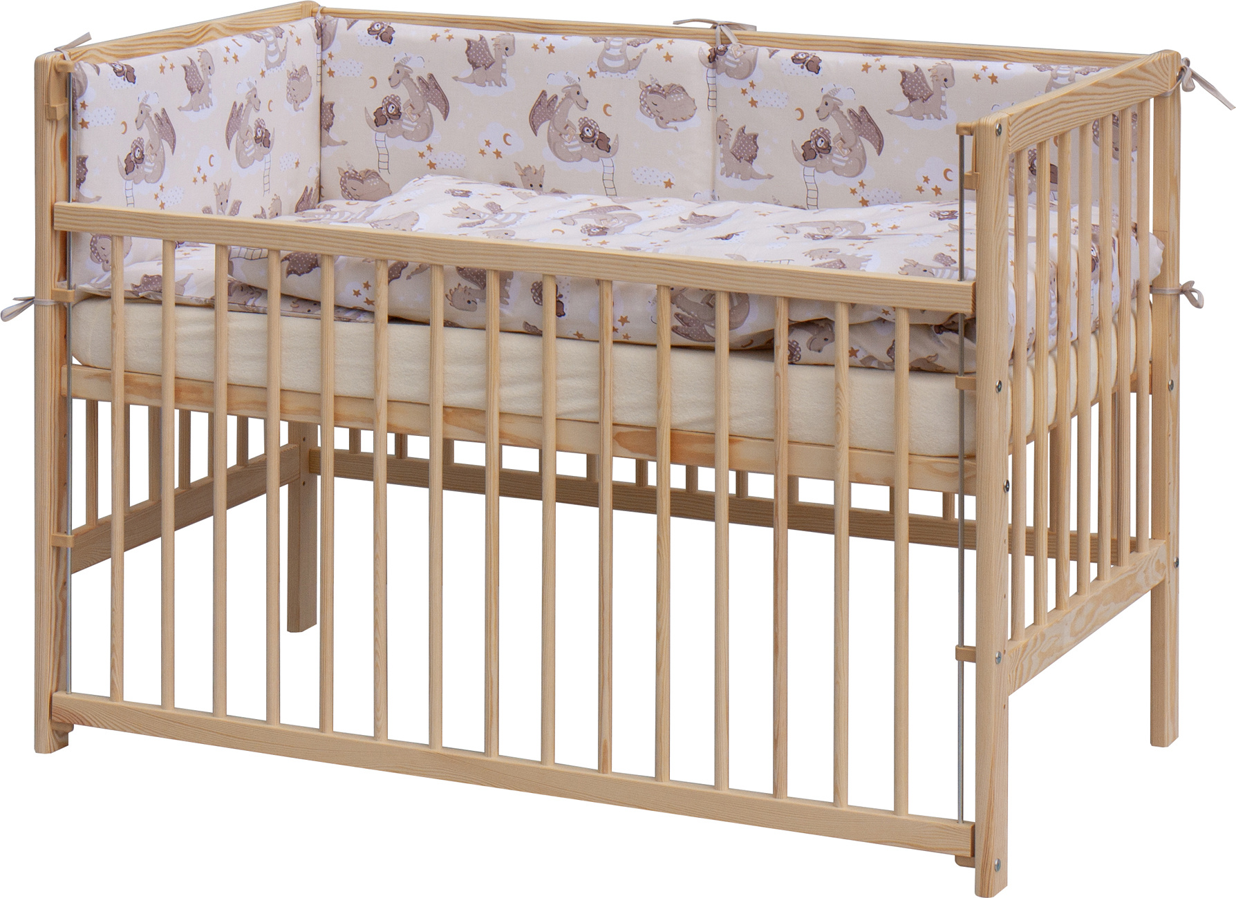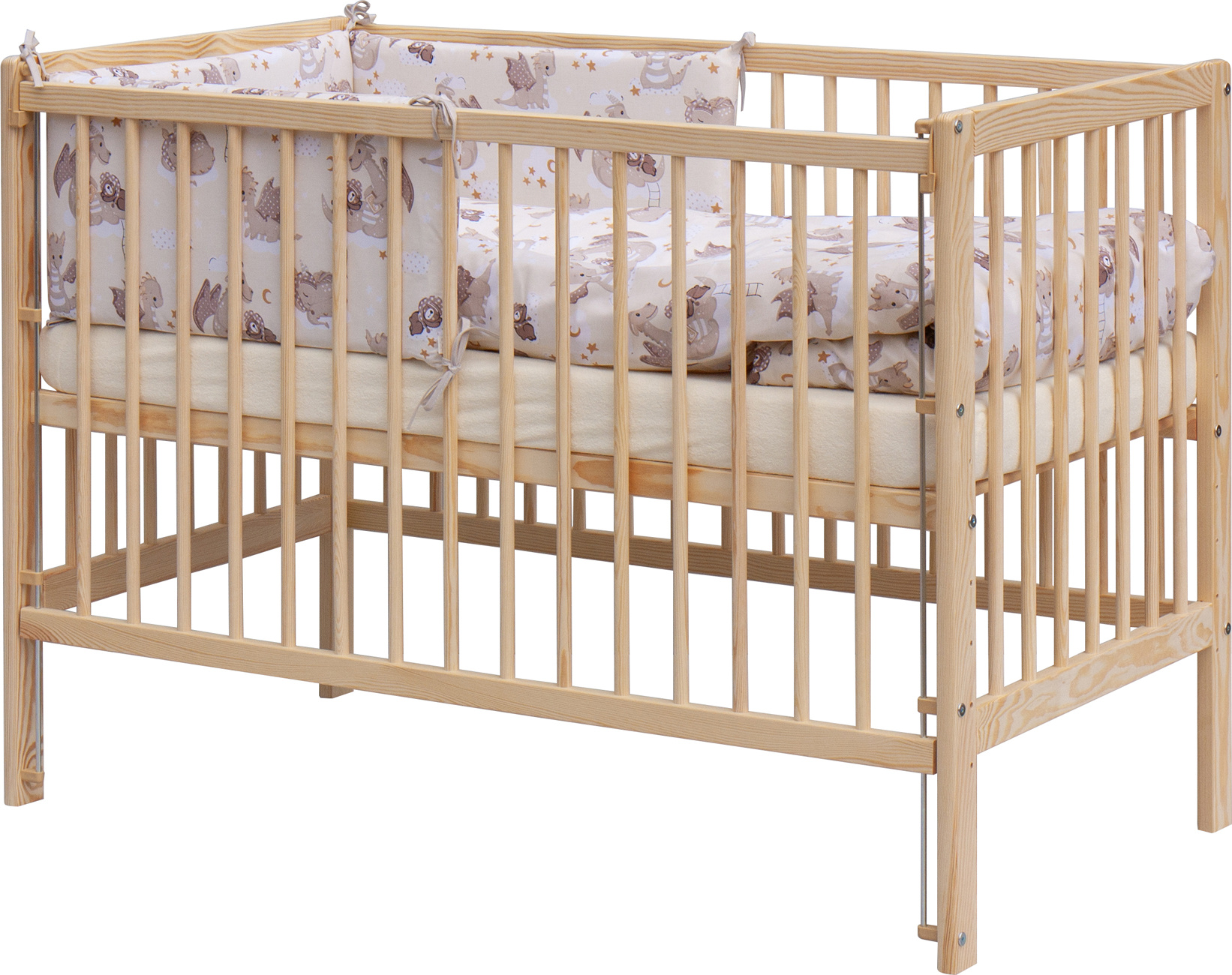 1. Dětská dřevěná postýlka 120 x 60 cm, masiv borovice, stahovací bok, 6 poloh roštu
