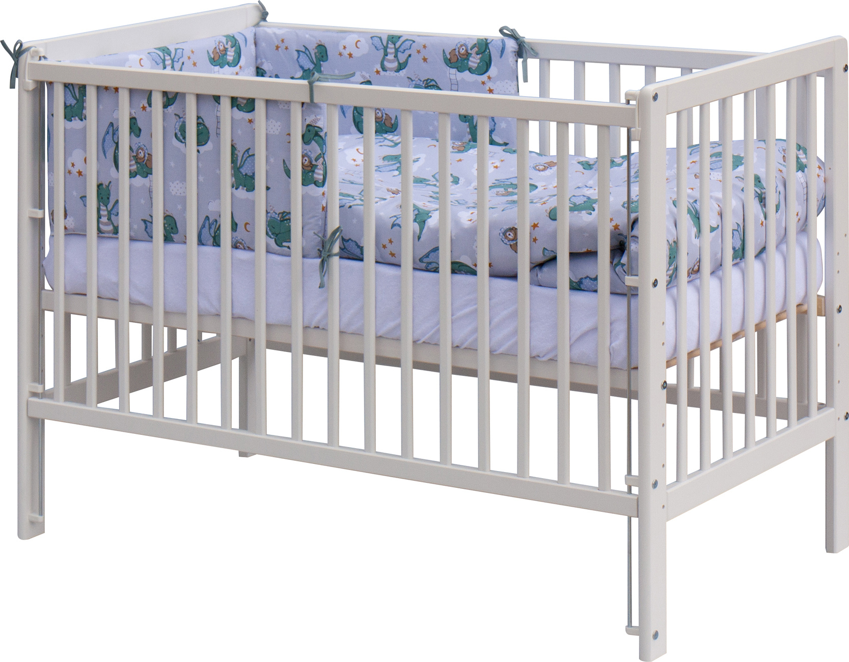 1. Dětská dřevěná postýlka 120 x 60 cm - bílá, masiv borovice, stahovací bok, 6 poloh roštu