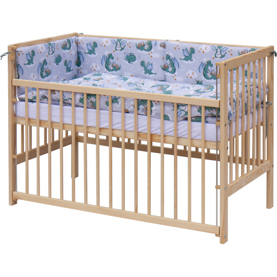 1. Dětská dřevěná postýlka 120 x 60 cm, masiv borovice, stahovací bok, 6 poloh roštu