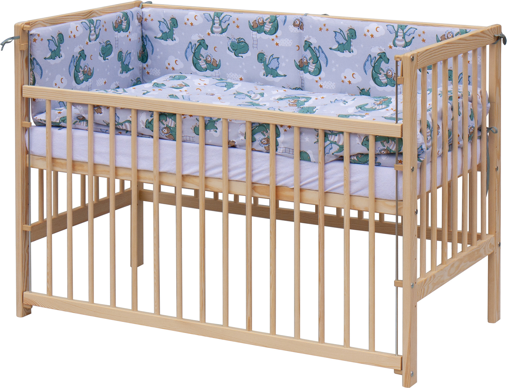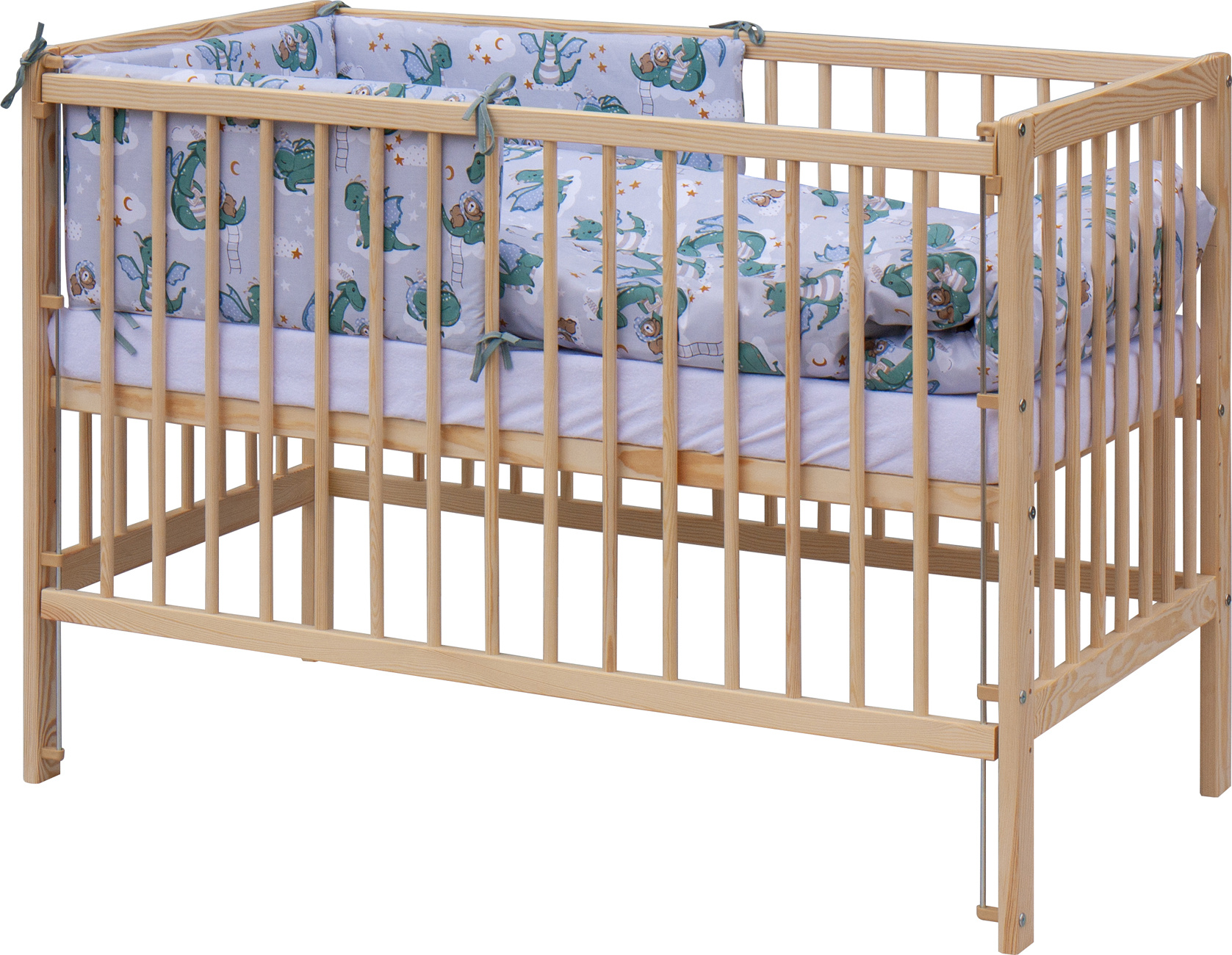 1. Dětská dřevěná postýlka 120 x 60 cm, masiv borovice, stahovací bok, 6 poloh roštu