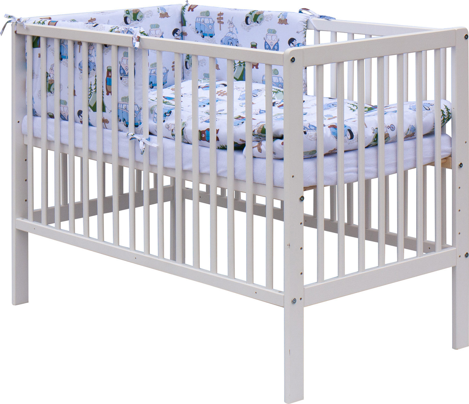 1. Dětská dřevěná postýlka 120 x 60 cm - bílá, masiv borovice, 3 vyndavací příčky, 5 poloh roštu, nohy postýlky jsou předvrtané pro nasazení koleček