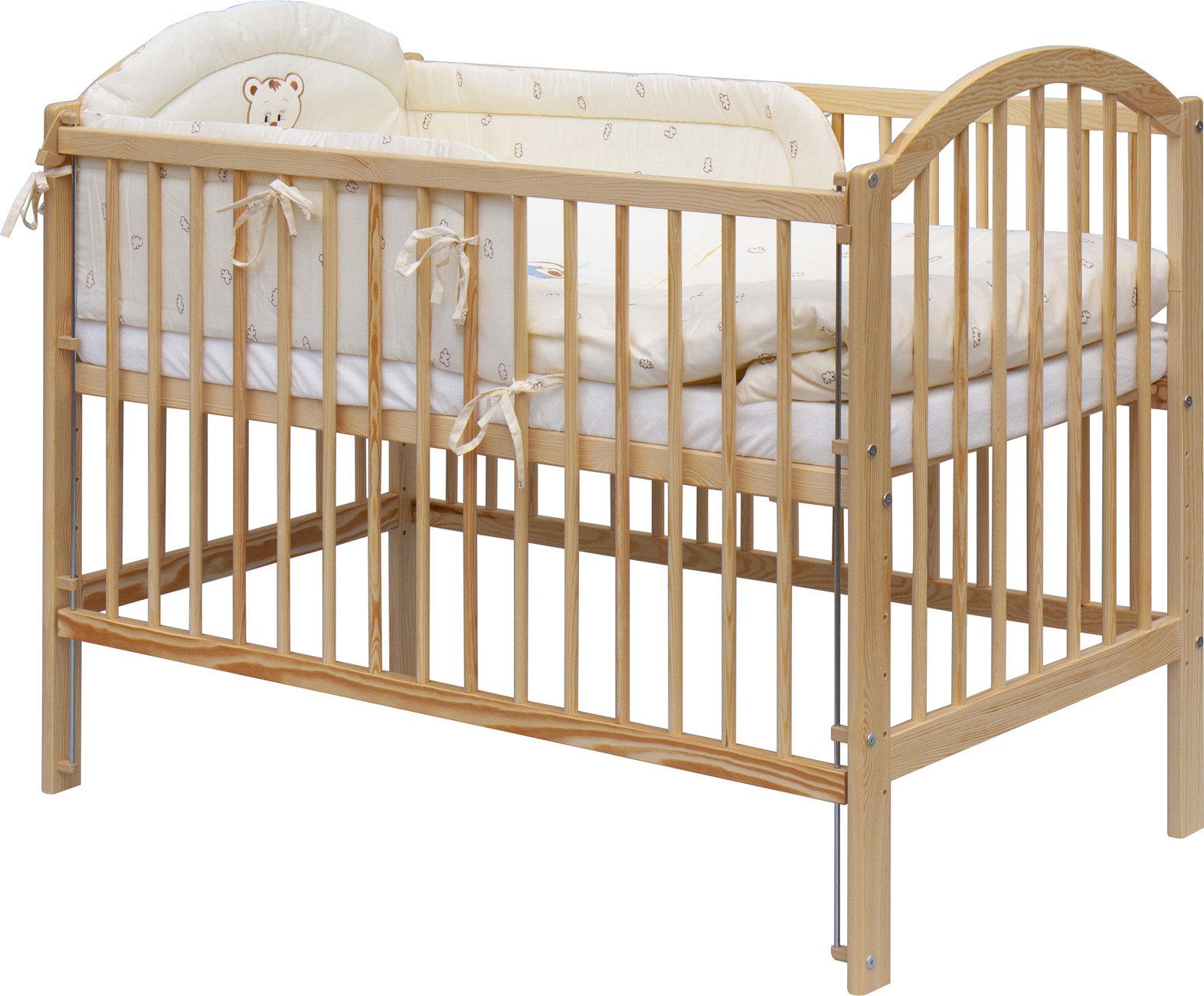 1. Dětská dřevěná postýlka 120 x 60 cm - přírodní, masiv borovice, stahovací bok, 6 poloh roštu