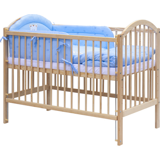 1. Dětská dřevěná postýlka 120 x 60 cm - přírodní, masiv borovice, stahovací bok, 6 poloh roštu