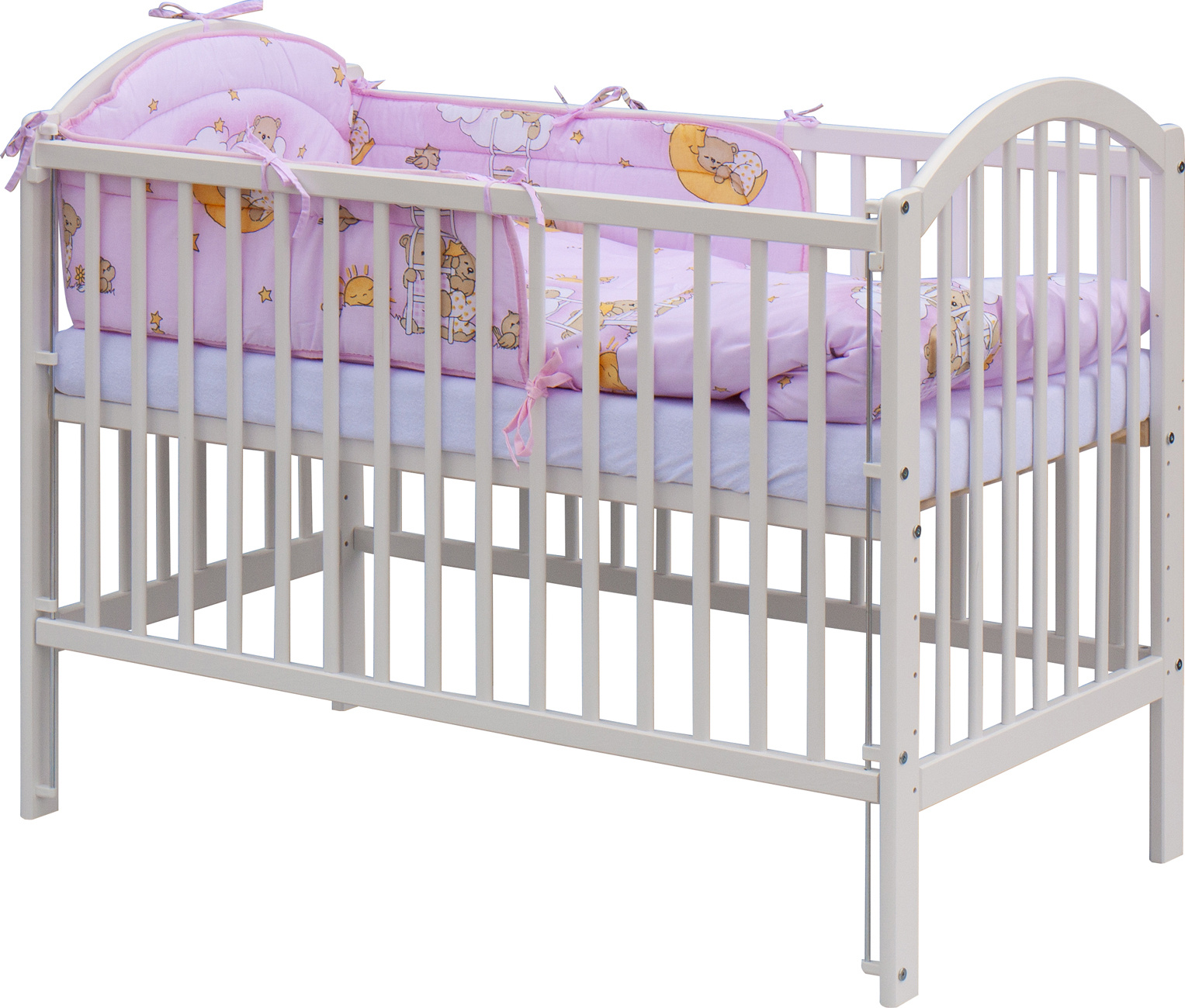 1. Dětská dřevěná postýlka 120 x 60 cm - bílá, masiv borovice, stahovací bok, 6 poloh roštu, nohy postýlky jsou předvrtané pro nasazení koleček