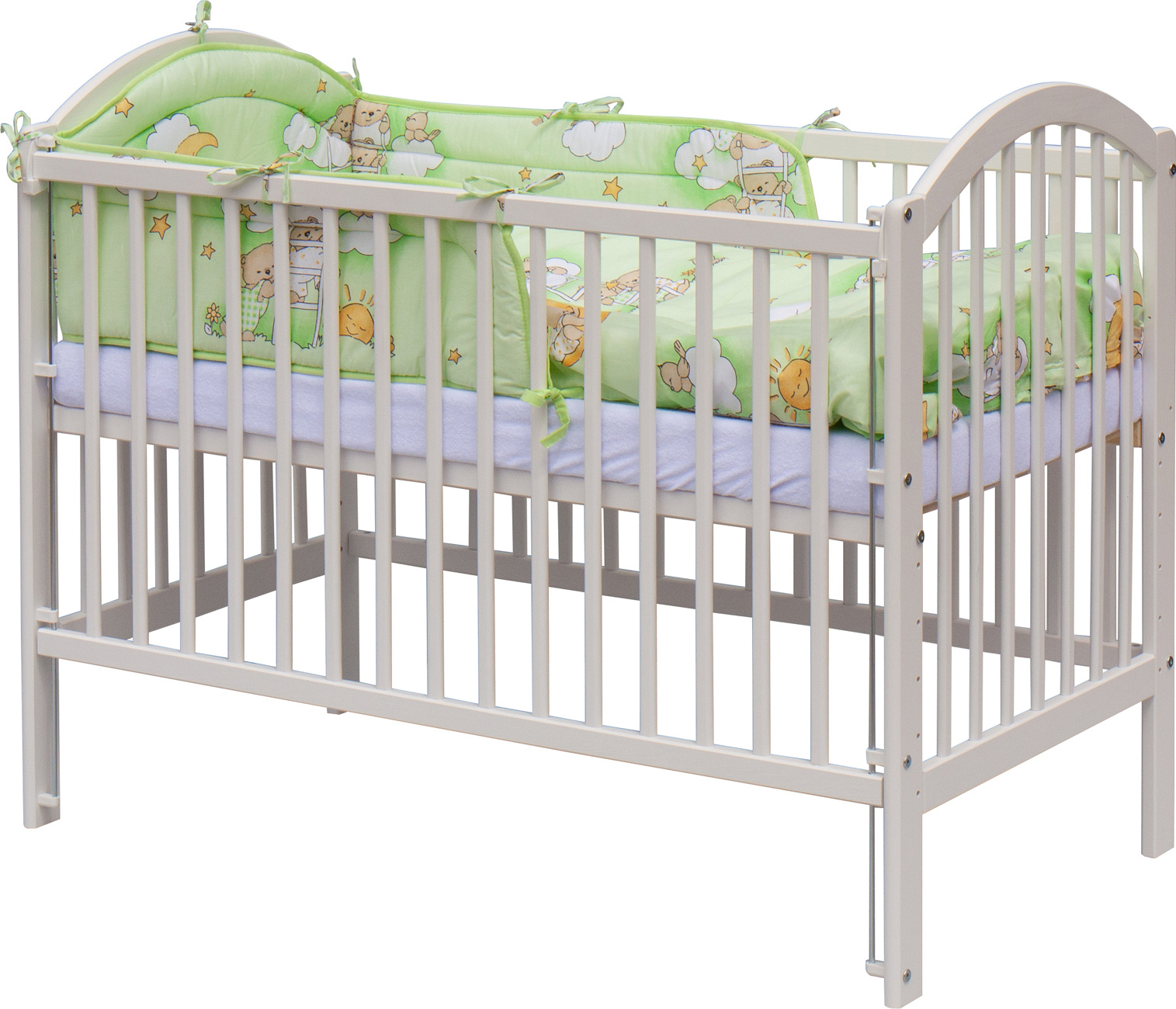 1. Dětská dřevěná postýlka 120 x 60 cm - bílá, masiv borovice, stahovací bok, 6 poloh roštu, nohy postýlky jsou předvrtané pro nasazení koleček