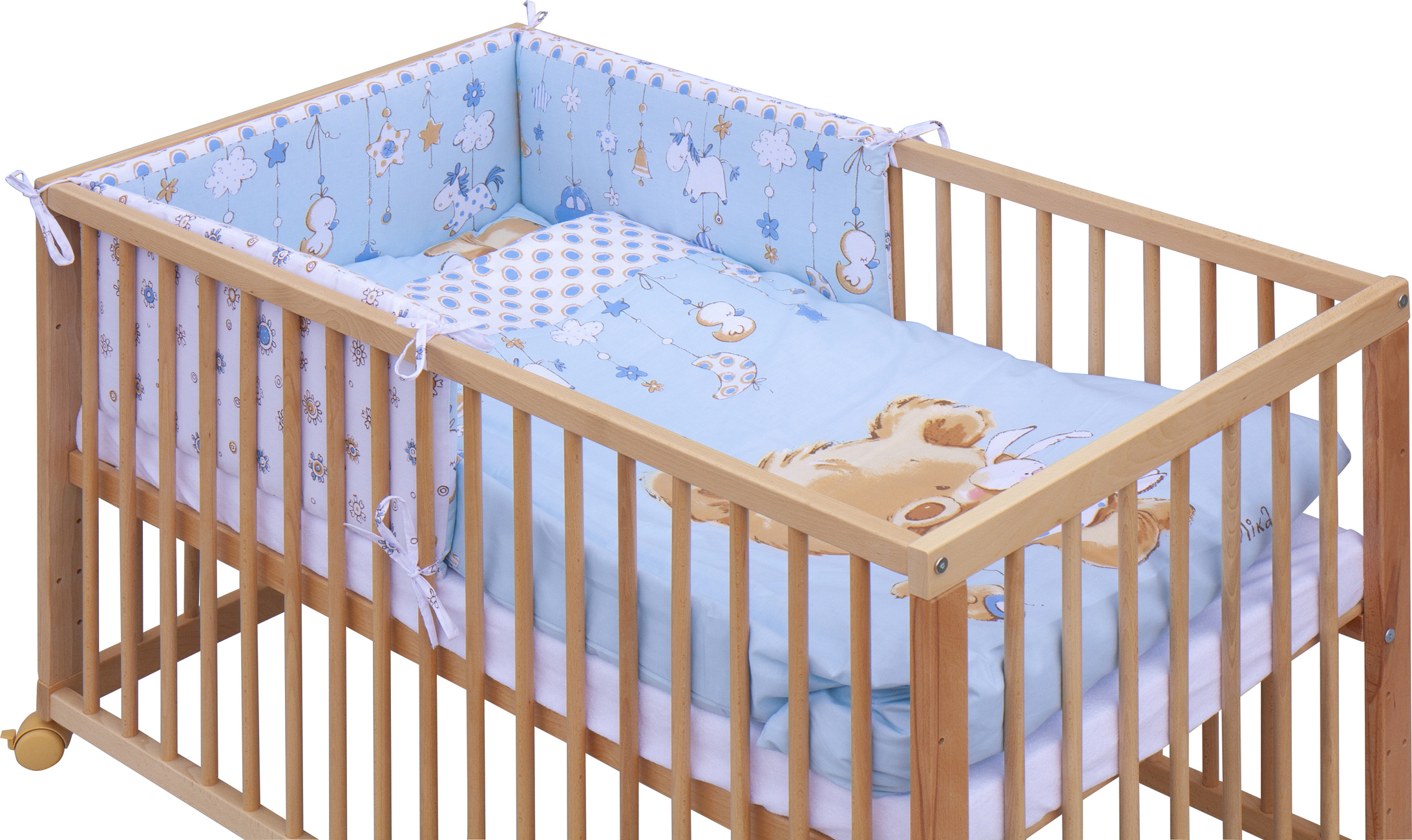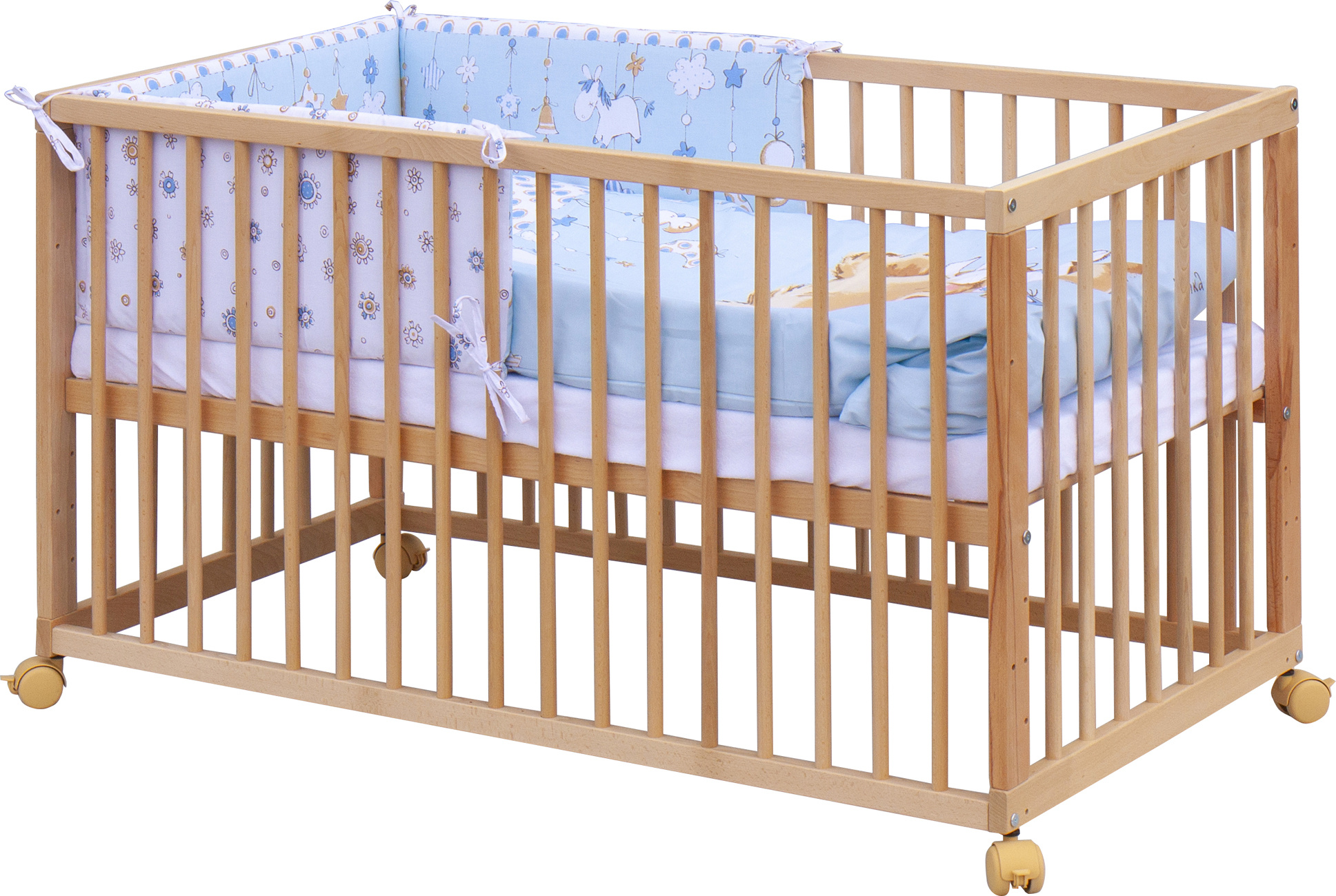 1. Dětská dřevěná postýlka 120 x 60 cm - přírodní, masiv buk, 3 vyndavací příčky, 5 poloh roštu, nohy postýlky jsou předvrtané pro nasazení koleček