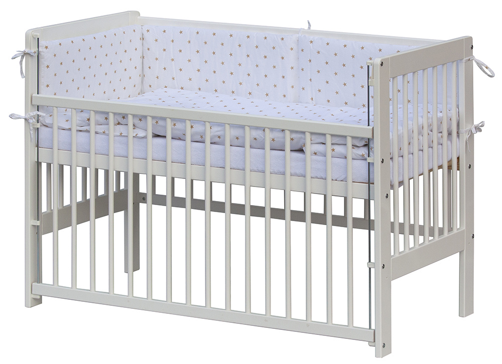 1. Dětská dřevěná postýlka 120x60 cm - bílá, masiv borovice, stahovací bok, 6 poloh roštu, nohy jsou předvrtané pro možné nasazení koleček