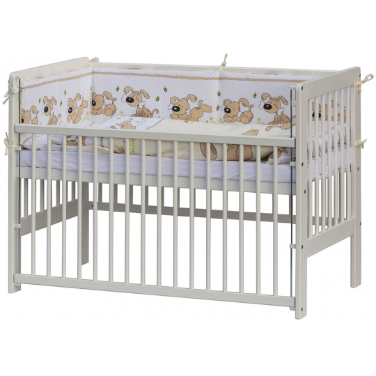 1. Dětská dřevěná postýlka 120x60 cm - bílá, masiv borovice, stahovací bok, 6 poloh roštu, nohy jsou předvrtané pro možné nasazení koleček