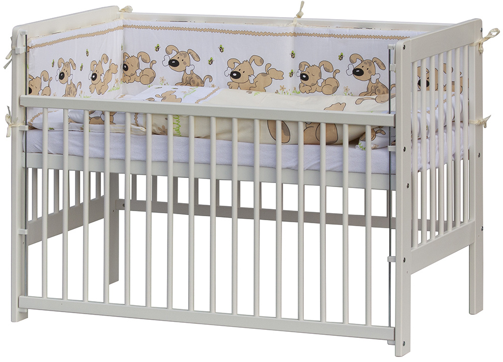 1. Dětská dřevěná postýlka 120x60 cm - bílá, masiv borovice, stahovací bok, 6 poloh roštu, nohy jsou předvrtané pro možné nasazení koleček