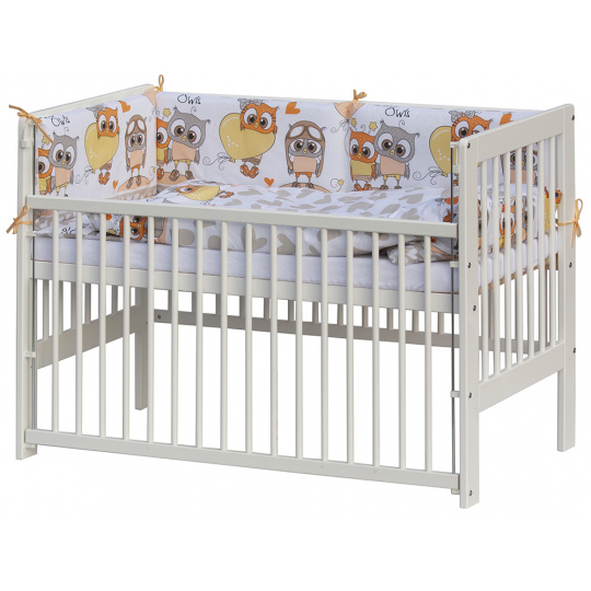 1. Dětská dřevěná postýlka 120x60 cm - bílá, masiv borovice, stahovací bok, 6 poloh roštu, nohy jsou předvrtané pro možné nasazení koleček