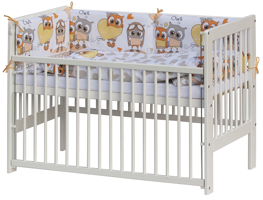 1. Dětská dřevěná postýlka 120x60 cm - bílá, masiv borovice, stahovací bok, 6 poloh roštu, nohy jsou předvrtané pro možné nasazení koleček