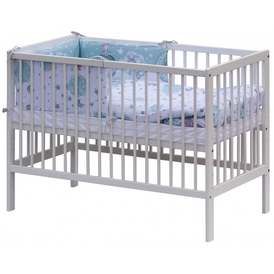 1. Dětská dřevěná postýlka 120x60 cm - bílá, masiv borovice, 3 vyndavací příčky, 5 poloh roštu, nohy jsou předvrtané pro možné nasazení koleček