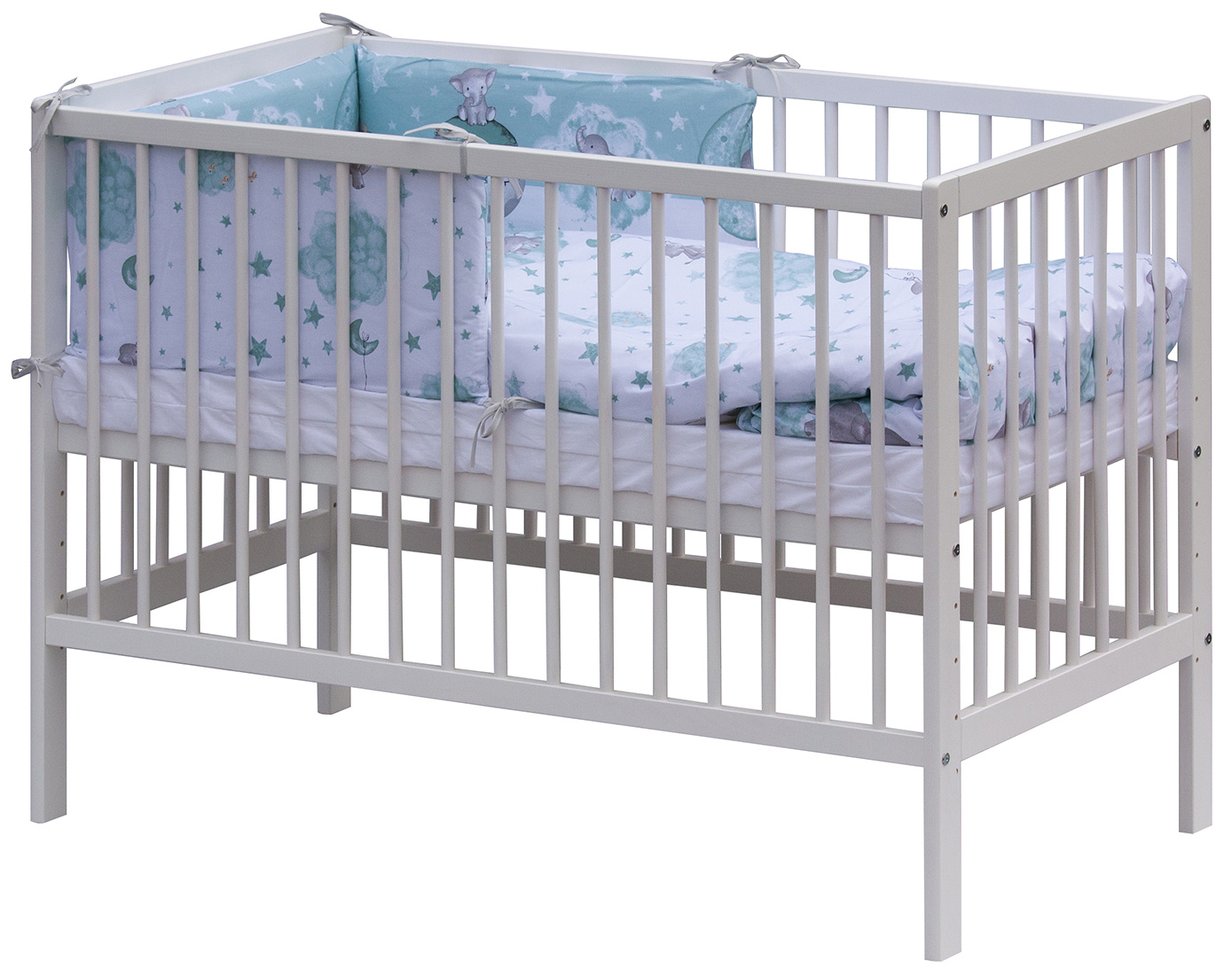 1. Dětská dřevěná postýlka 120x60 cm - bílá, masiv borovice, 3 vyndavací příčky, 5 poloh roštu, nohy jsou předvrtané pro možné nasazení koleček