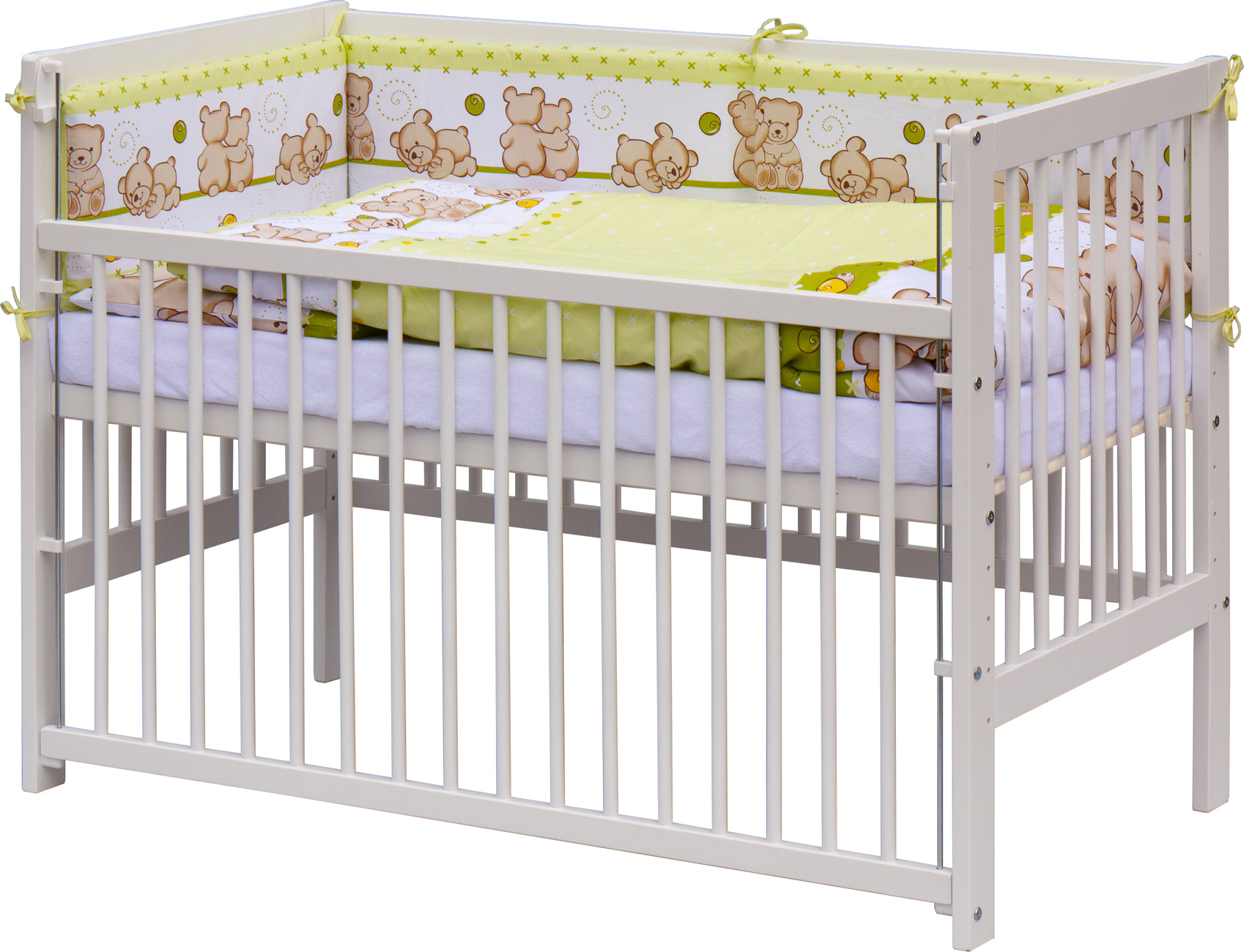 1. Dětská dřevěná postýlka 120x60 cm - bílá, masiv buk, stahovací bok, 6 poloh roštu