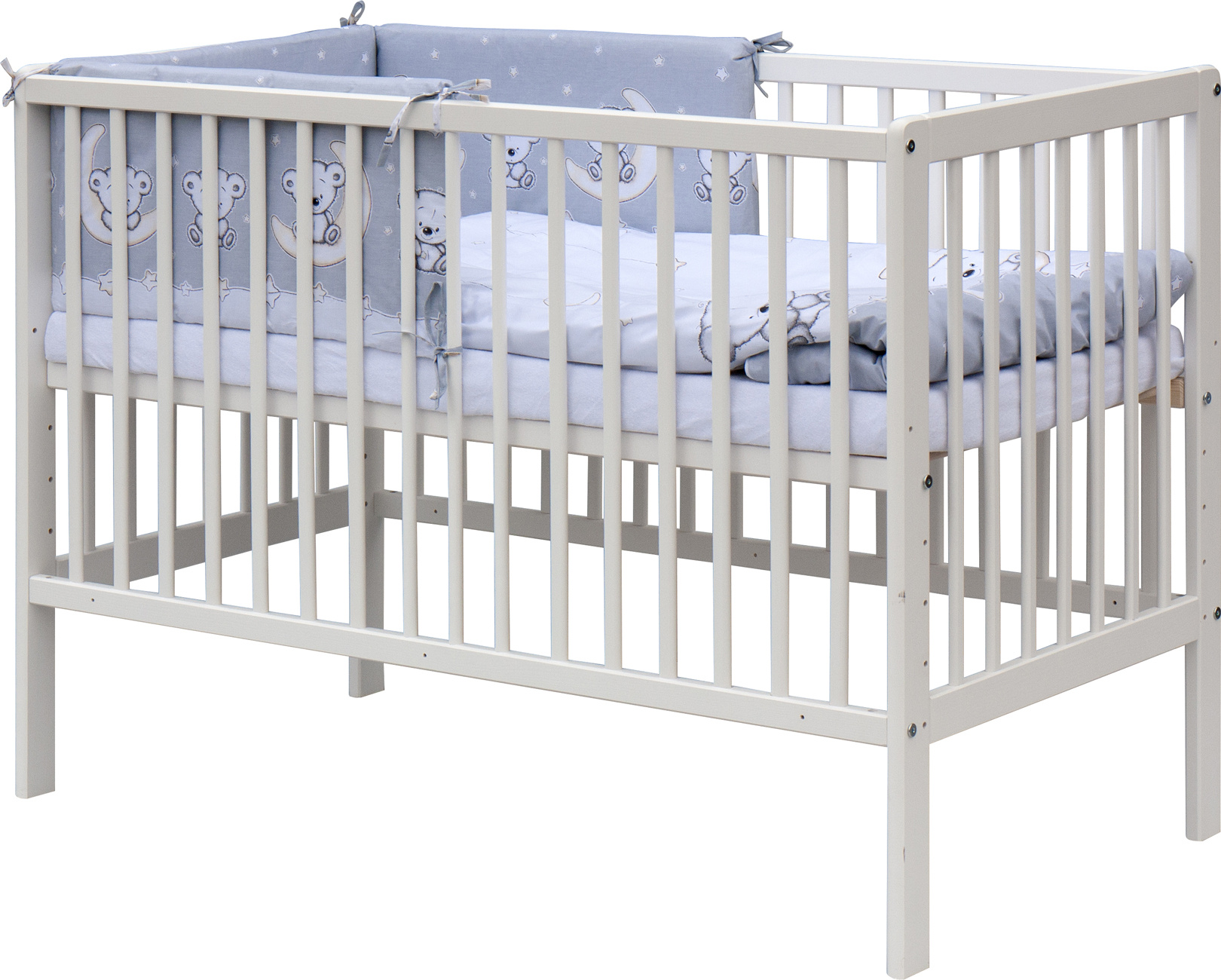 1. Dětská dřevěná postýlka 120 x 60 cm - bílá, masiv borovice, 3 vyndavací příčky, 5 poloh roštu, nohy postýlky jsou předvrtané pro nasazení koleček