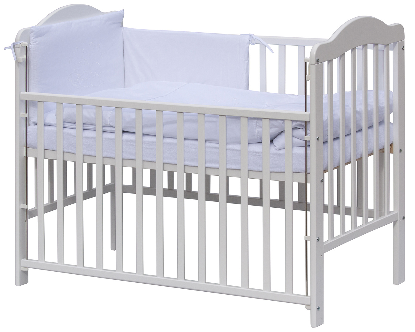1. Dětská dřevěná postýlka 120 x 60 cm - bílá, masiv borovice, stahovací bok, 6 poloh roštu