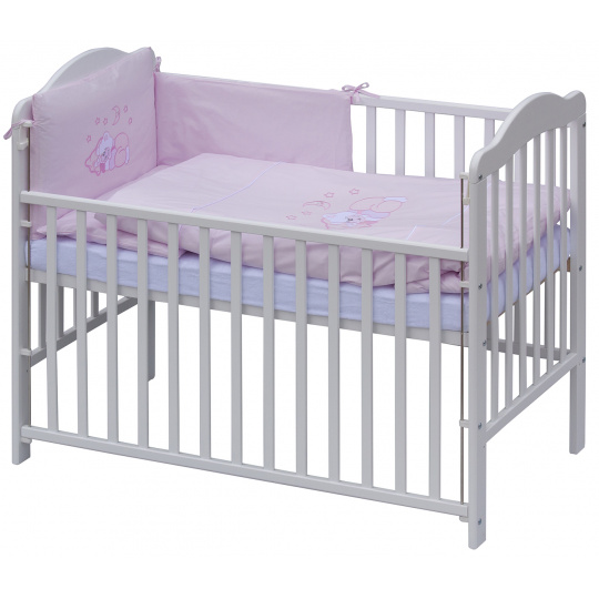 1. Dětská dřevěná postýlka 120 x 60 cm - bílá, masiv borovice, stahovací bok, 6 poloh roštu