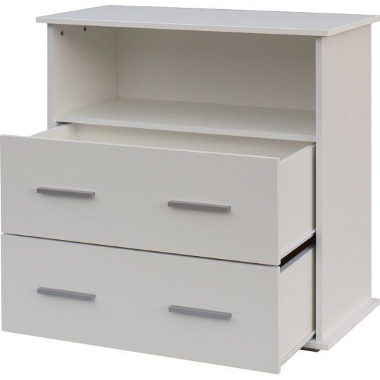 Komoda má dvě zásuvky s výsuvem a horní polici