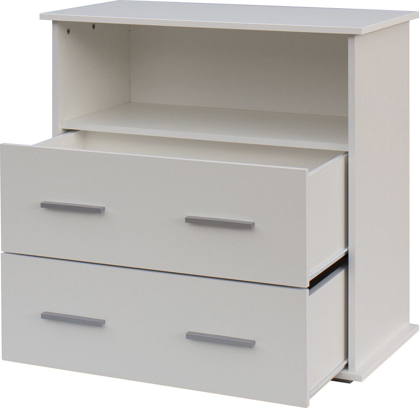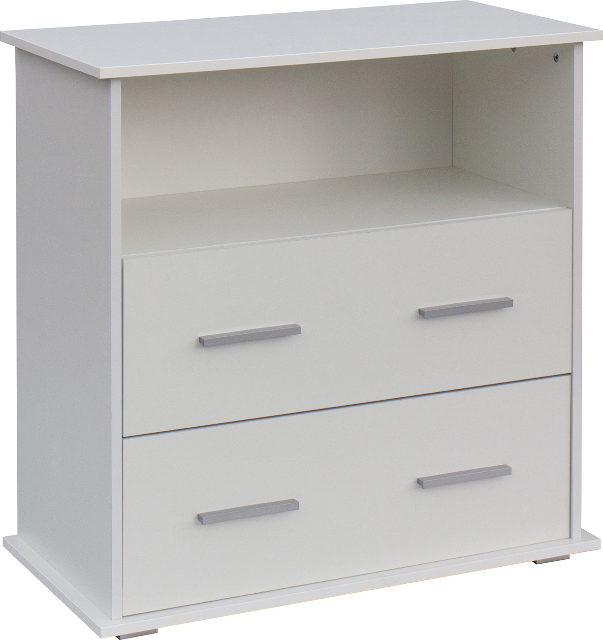 Komoda má dvě zásuvky s výsuvem a horní polici