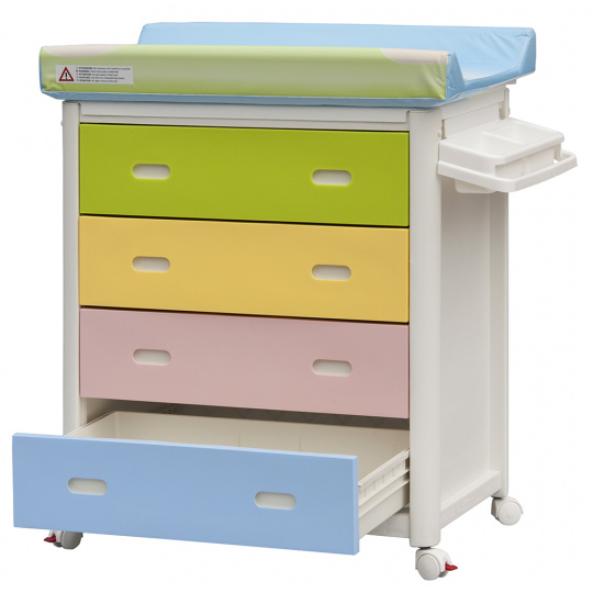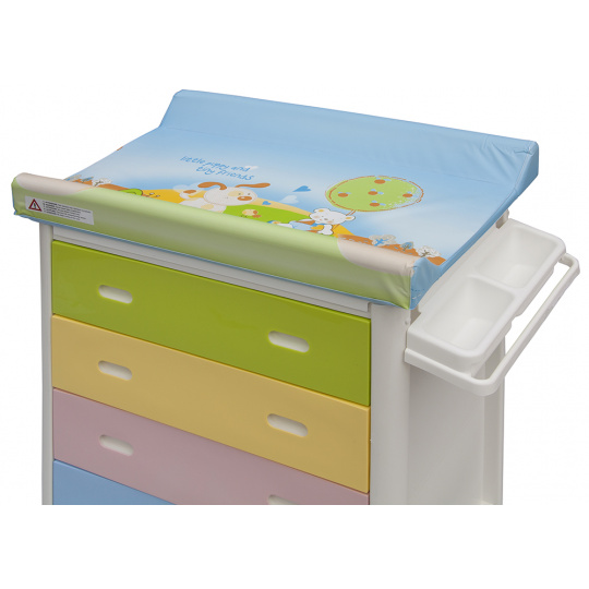 Materiál celé komody je zdravotně nezávadný plast. Komoda je vybavena kolečky s brzdou. Komodu lze tedy velmi jednoduše přesouvat dle potřeby. Po odklopení tvarovaného přebalovacího pultu se zpřístupní vanička.