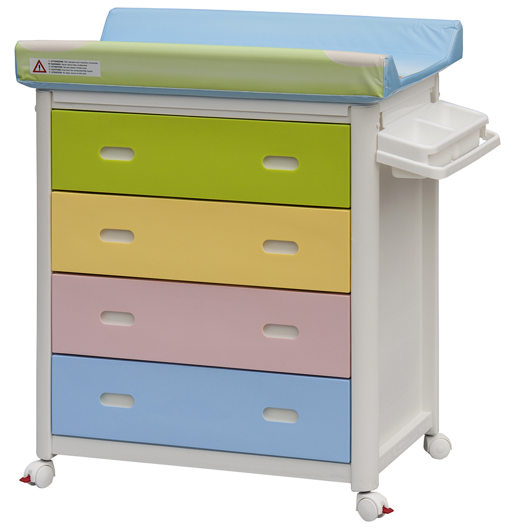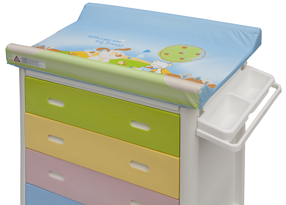 Materiál celé komody je zdravotně nezávadný plast. Komoda je vybavena kolečky s brzdou. Komodu lze tedy velmi jednoduše přesouvat dle potřeby. Po odklopení tvarovaného přebalovacího pultu se zpřístupní vanička.