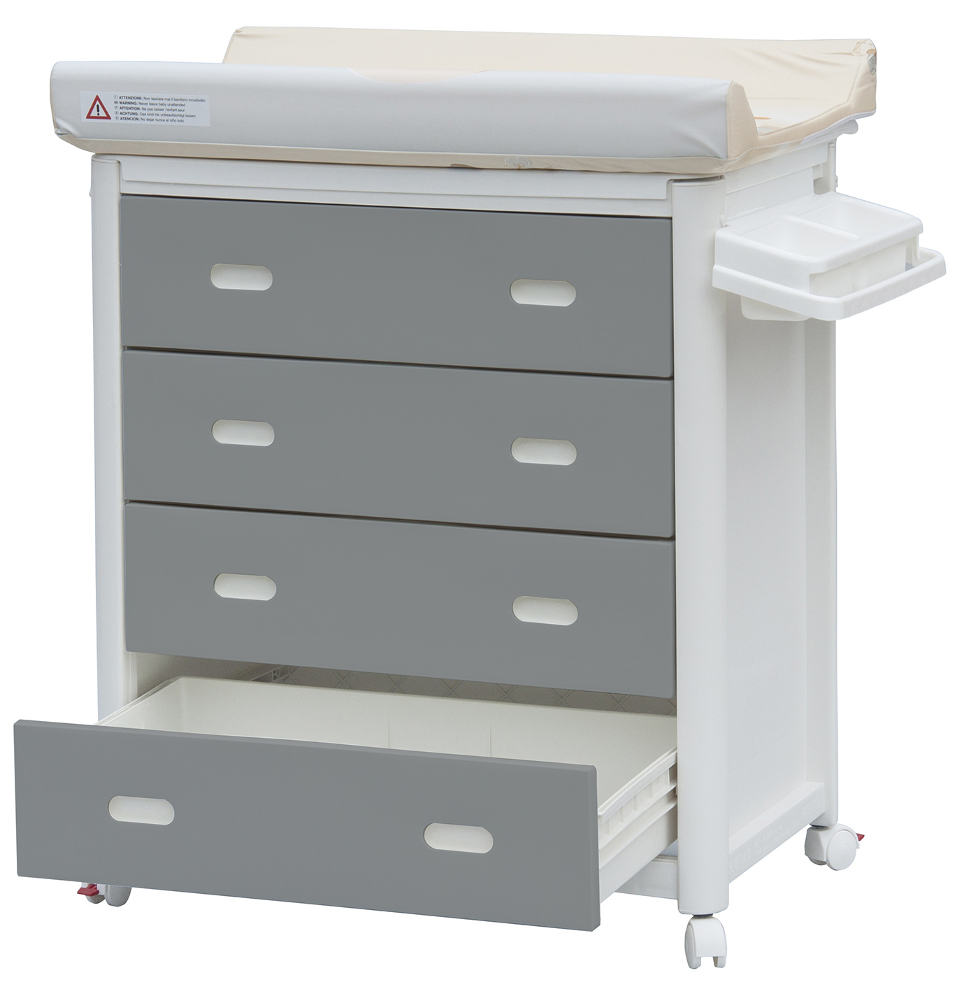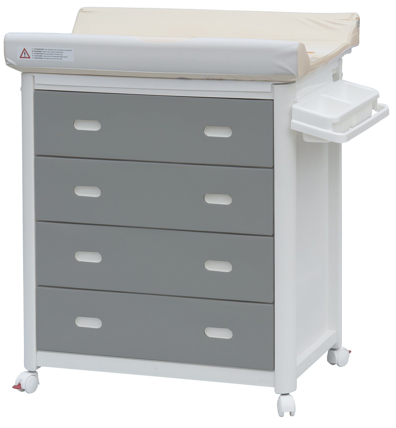 Materiál celé komody je zdravotně nezávadný plast. Komoda je vybavena kolečky s brzdou. Komodu lze tedy velmi jednoduše přesouvat dle potřeby. Po odklopení tvarovaného přebalovacího pultu se zpřístupní vanička.