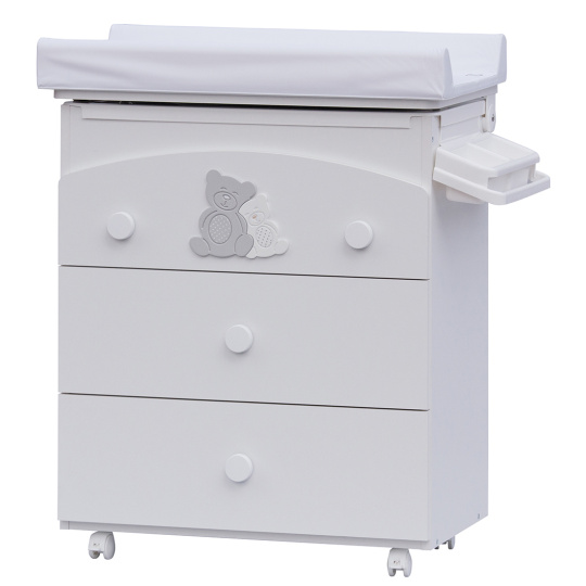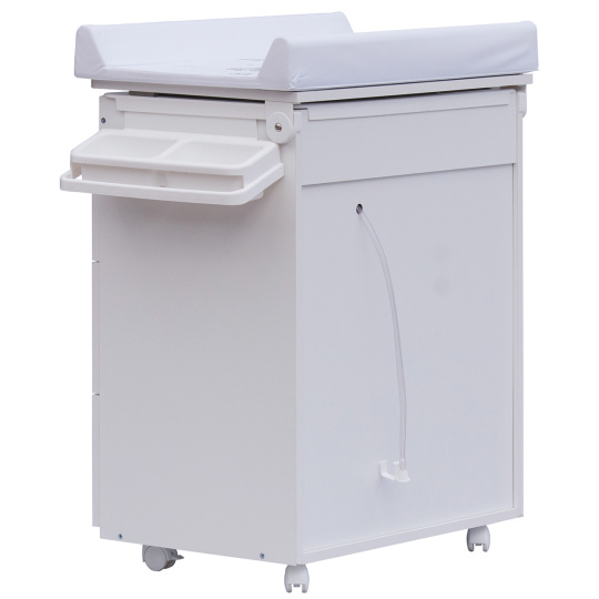 Laminátová přebalovací komoda je doplněna o plastovou vaničku s odkládacími boxy. Vanička je umístěna pod deskou. Pro snadný odvod použité vody je komoda doplněna výtokovou hadicí s uzávěrem. Vaničku lze zcela vyjmout a komodu lze používat jako běžný nábytek do dětského pokoje.