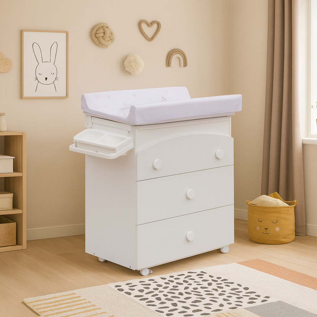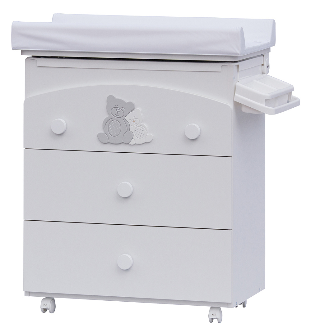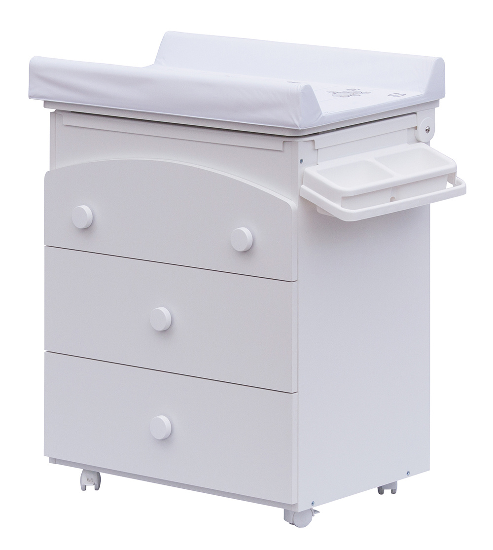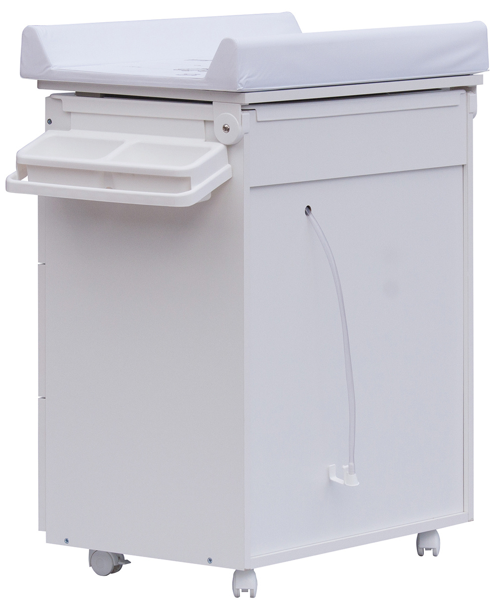 Laminátová přebalovací komoda je doplněna o plastovou vaničku s odkládacími boxy. Vanička je umístěna pod deskou. Pro snadný odvod použité vody je komoda doplněna výtokovou hadicí s uzávěrem. Vaničku lze zcela vyjmout a komodu lze používat jako běžný nábytek do dětského pokoje.