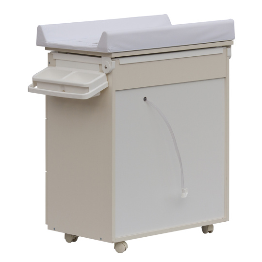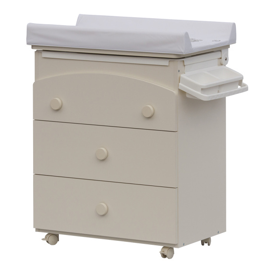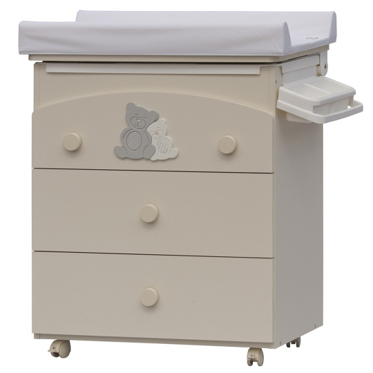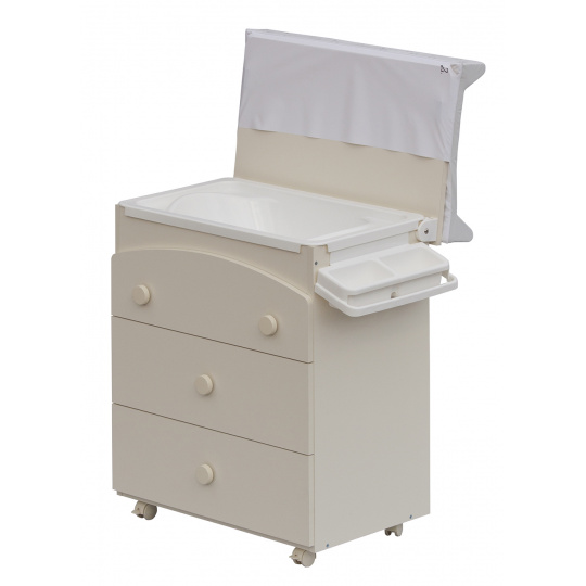 Laminátová přebalovací komoda je doplněna o plastovou vaničku s odkládacími boxy. Vanička je umístěna pod deskou. Pro snadný odvod použité vody je komoda doplněna výtokovou hadicí s uzávěrem. Vaničku lze zcela vyjmout a komodu lze používat jako běžný nábytek do dětského pokoje.