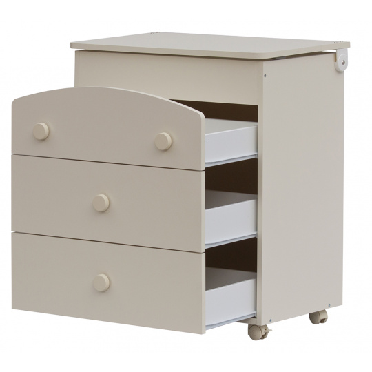 Komoda je také opatřena plastovými kolečky, dvě jsou s brzdou. Komodu lze tedy velmi jednoduše přesouvat dle potřeby. Horní deska nad vaničkou je připevněna na otočných kloubech pro snadné zvedání. Komoda je dále opatřena třemi velkými šuplíky.