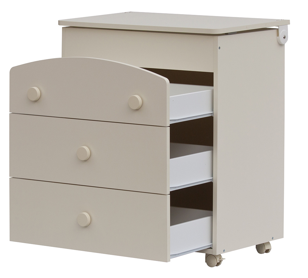Komoda je také opatřena plastovými kolečky, dvě jsou s brzdou. Komodu lze tedy velmi jednoduše přesouvat dle potřeby. Horní deska nad vaničkou je připevněna na otočných kloubech pro snadné zvedání. Komoda je dále opatřena třemi velkými šuplíky.