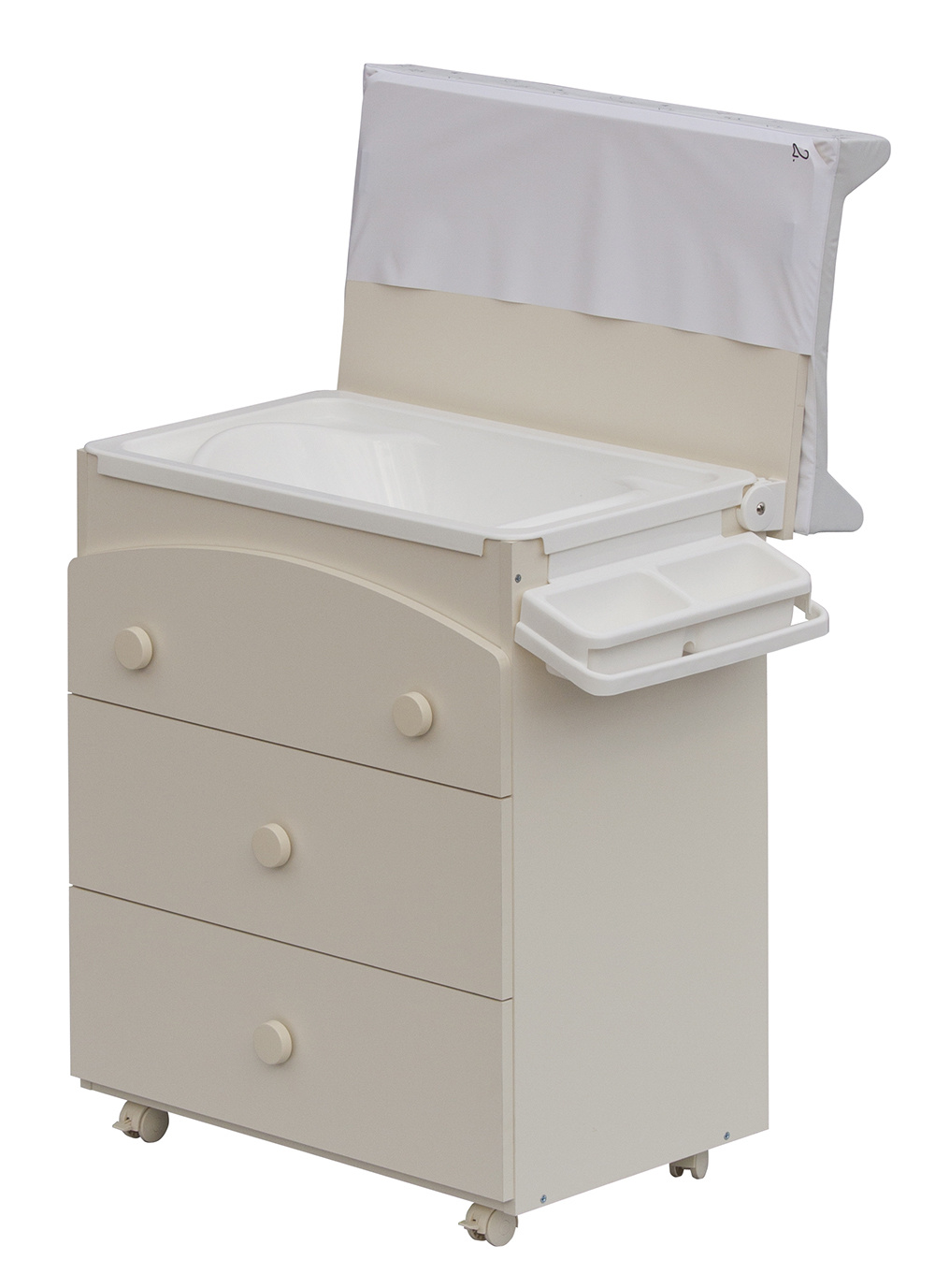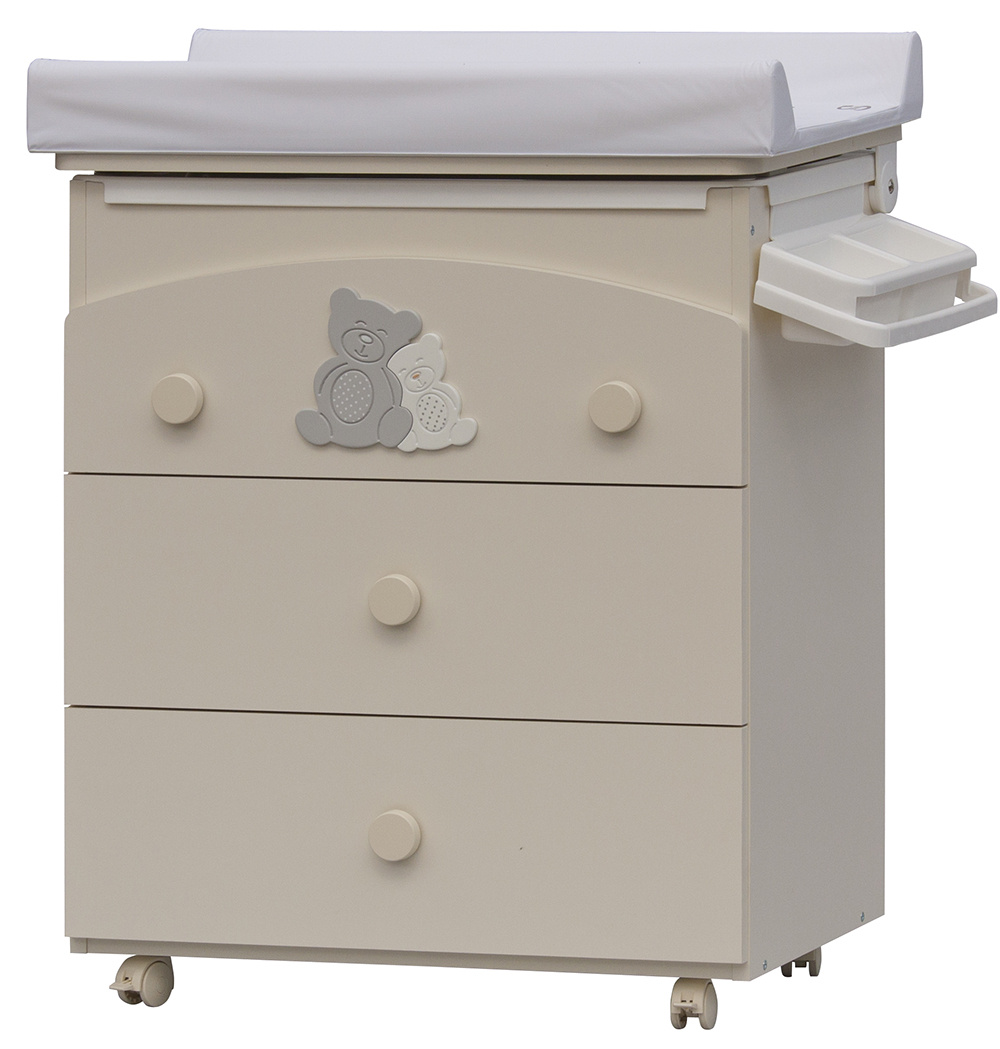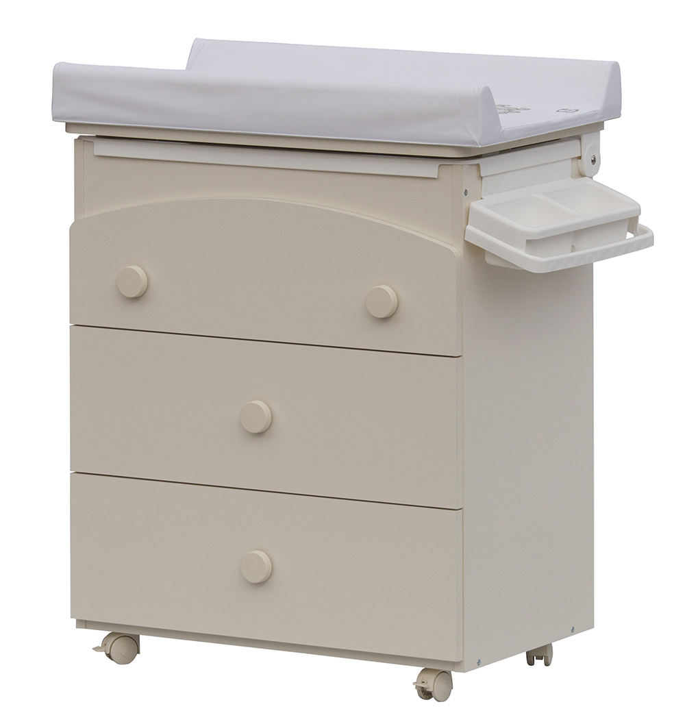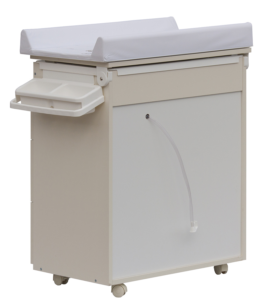 Laminátová přebalovací komoda je doplněna o plastovou vaničku s odkládacími boxy. Vanička je umístěna pod deskou. Pro snadný odvod použité vody je komoda doplněna výtokovou hadicí s uzávěrem. Vaničku lze zcela vyjmout a komodu lze používat jako běžný nábytek do dětského pokoje.