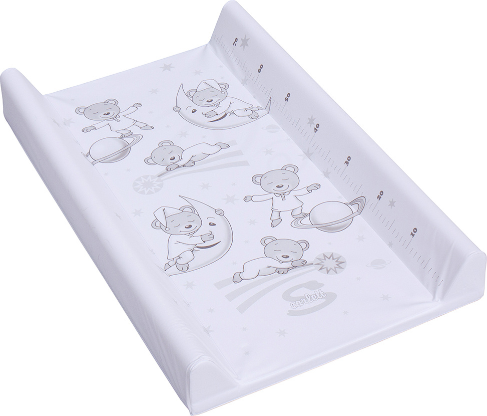 Přebalovací podložka s kapsou na spodní straně a profilovanými okraji z kvalitním PVC potahem bez ftalátů, vyplněná molitanem. Tato podložka je určena na komody s výklopnou deskou. Motivy přebalovacích podložek se často obměňují.