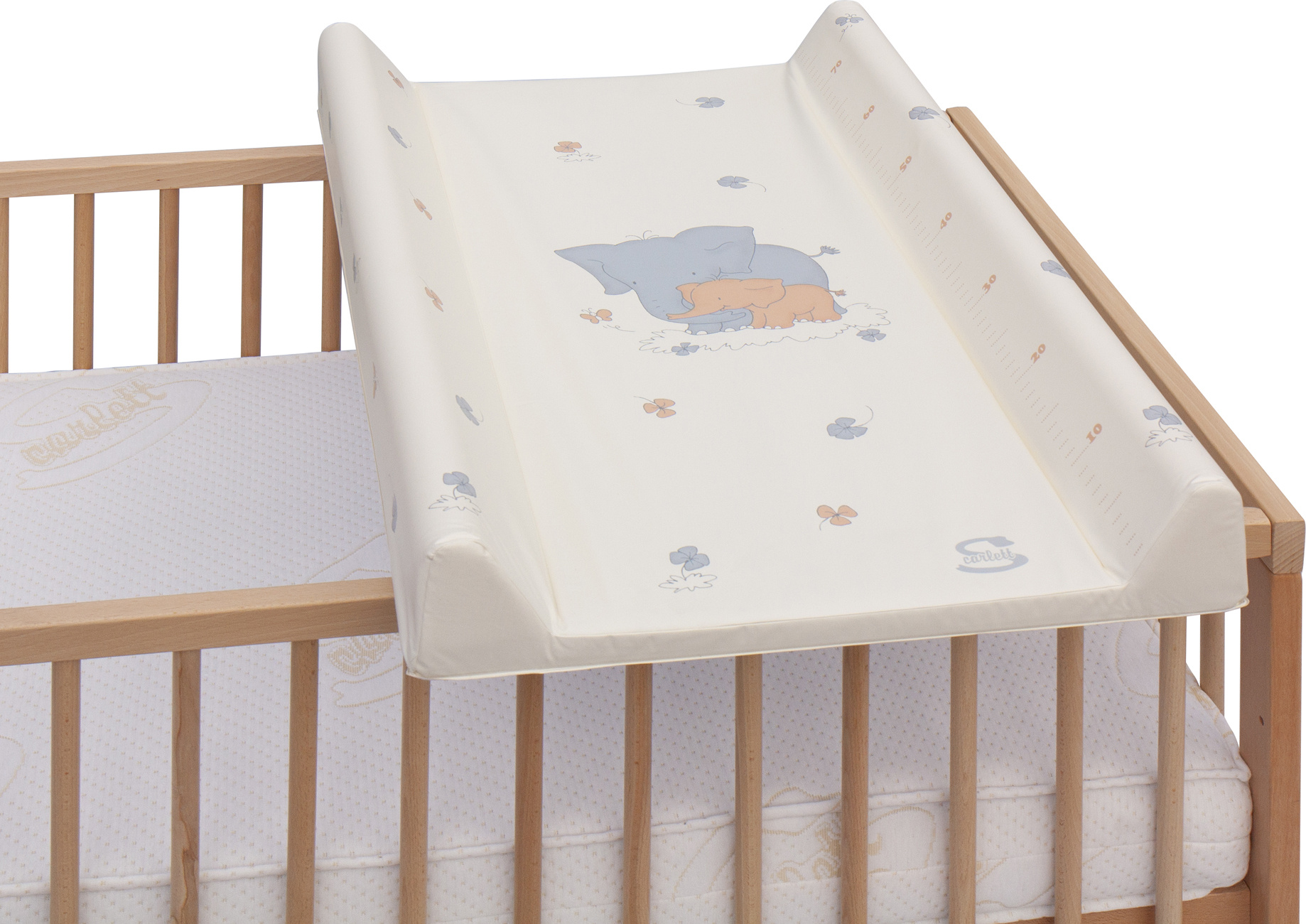 Přebalovací podložka s pevnou vložkou z MDF a profilovanými okraji s kvalitním PVC potahem bez ftalátů, vyplněná molitanem.