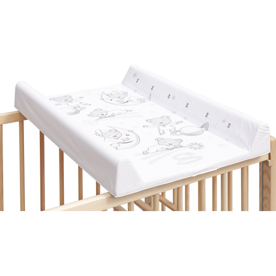 Přebalovací podložka s pevnou vložkou z MDF a profilovanými okraji s kvalitním PVC potahem bez ftalátů, vyplněná molitanem.