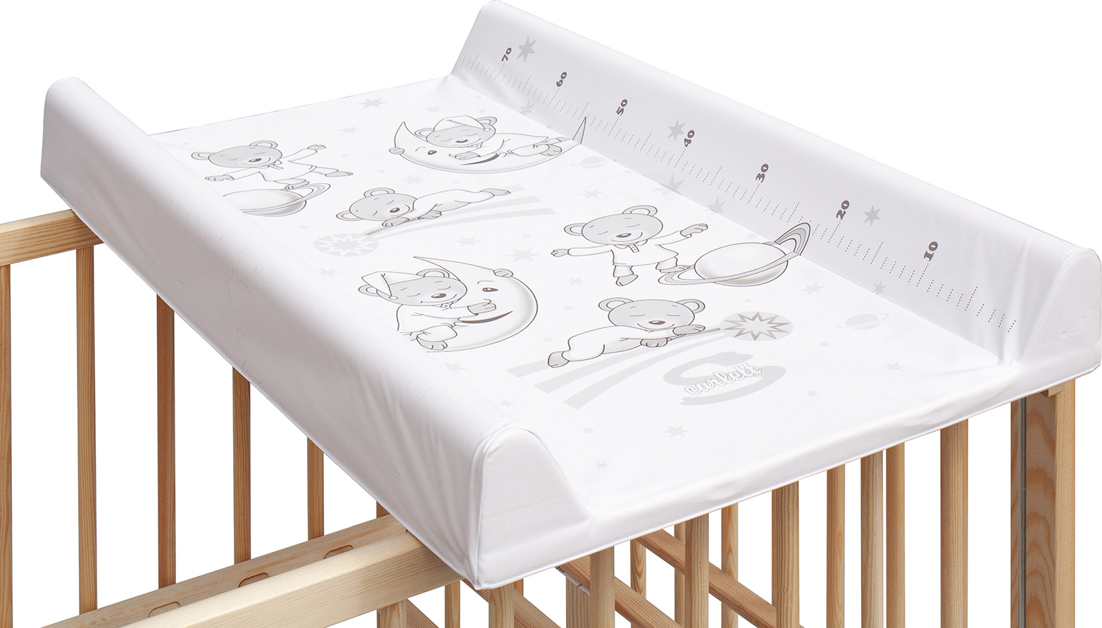 Přebalovací podložka s pevnou vložkou z MDF a profilovanými okraji s kvalitním PVC potahem bez ftalátů, vyplněná molitanem.