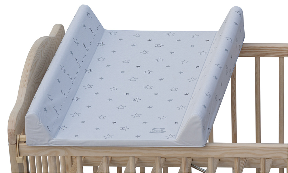 Přebalovací podložka s pevnou vložkou z MDF a profilovanými okraji s kvalitním PVC potahem bez ftalátů, vyplněná molitanem.