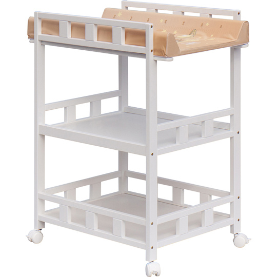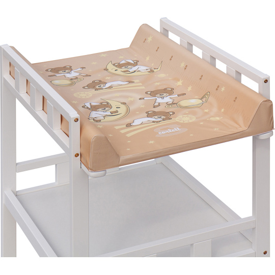 Praktický přebalovací pult se dvěmi policemi z HDF desky. Vrchní přebalovací pult z polyuretanu potažený omyvatelným PVC, vyztužený MDF deskou.