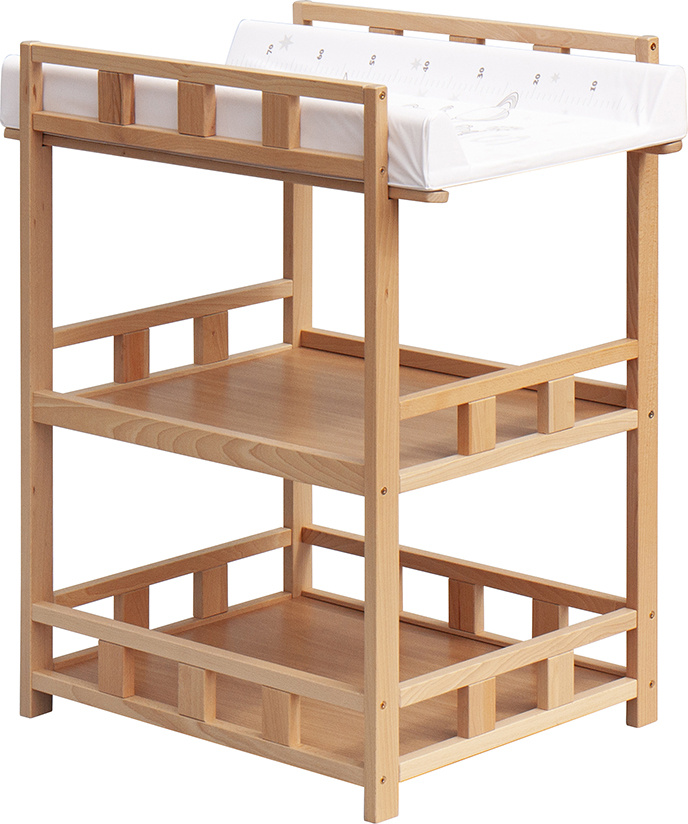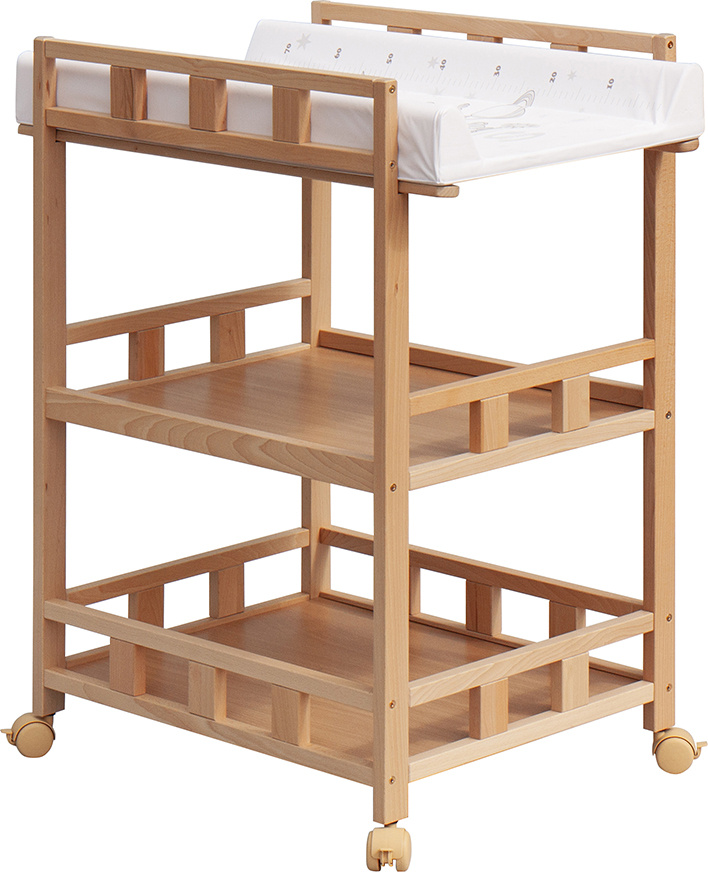 Praktický přebalovací pult se dvěmi policemi z HDF desky. Vrchní přebalovací pult z polyuretanu potažený omyvatelným PVC, vyztužený MDF deskou.