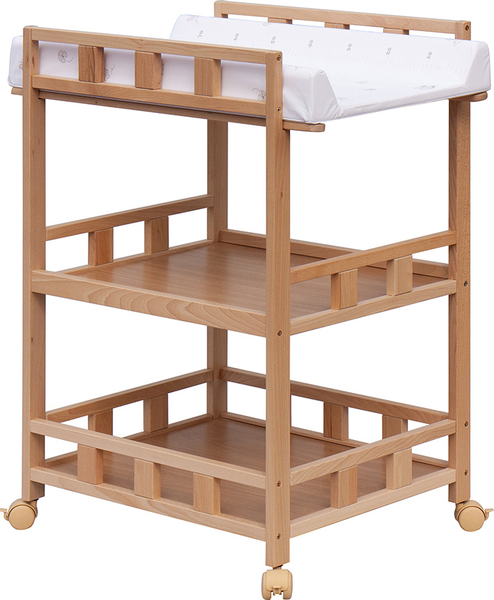 Praktický přebalovací pult se dvěmi policemi z HDF desky. Vrchní přebalovací pult z polyuretanu potažený omyvatelným PVC, vyztužený MDF deskou.