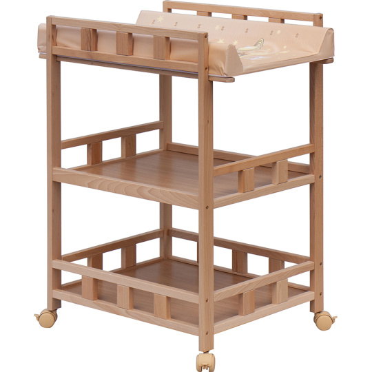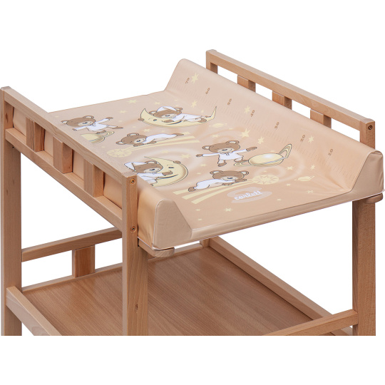 Praktický přebalovací pult se dvěmi policemi z HDF desky. Vrchní přebalovací pult z polyuretanu potažený omyvatelným PVC, vyztužený MDF deskou.