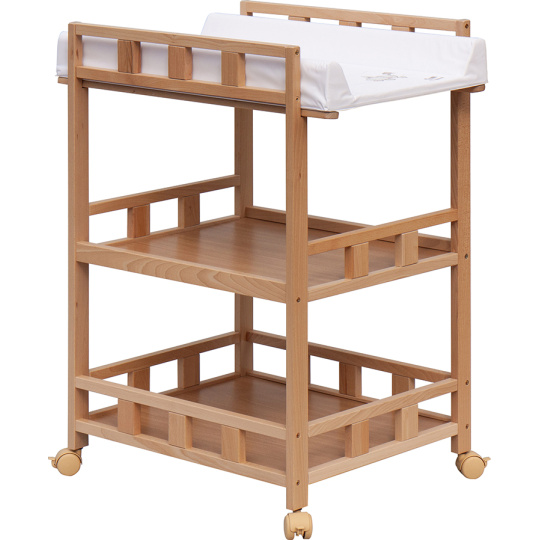 Praktický přebalovací pult se dvěmi policemi z HDF desky. Vrchní přebalovací pult z polyuretanu potažený omyvatelným PVC, vyztužený MDF deskou.