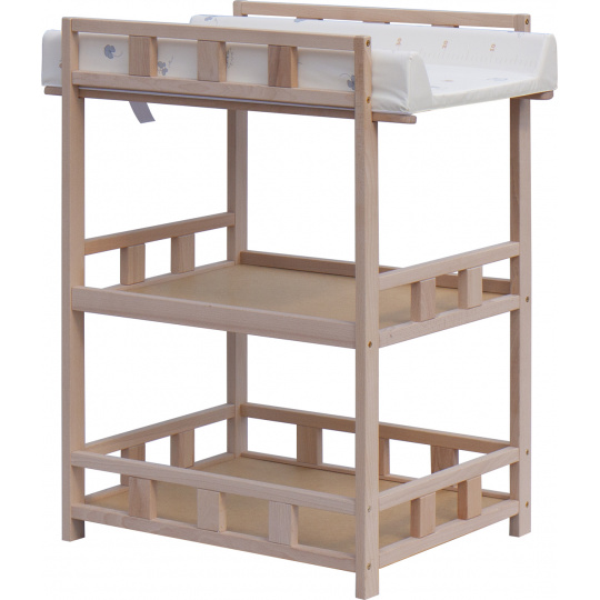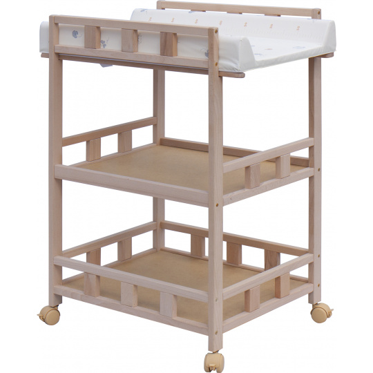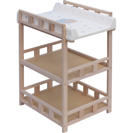 Praktický přebalovací pult se dvěmi policemi z HDF desky. Vrchní přebalovací pult z polyuretanu potažený omyvatelným PVC, vyztužený MDF deskou.