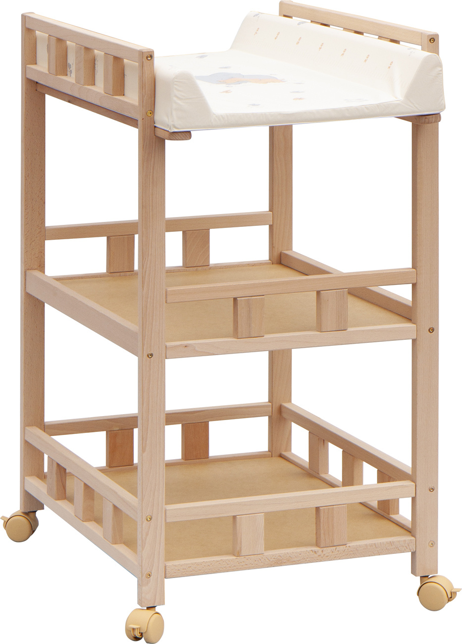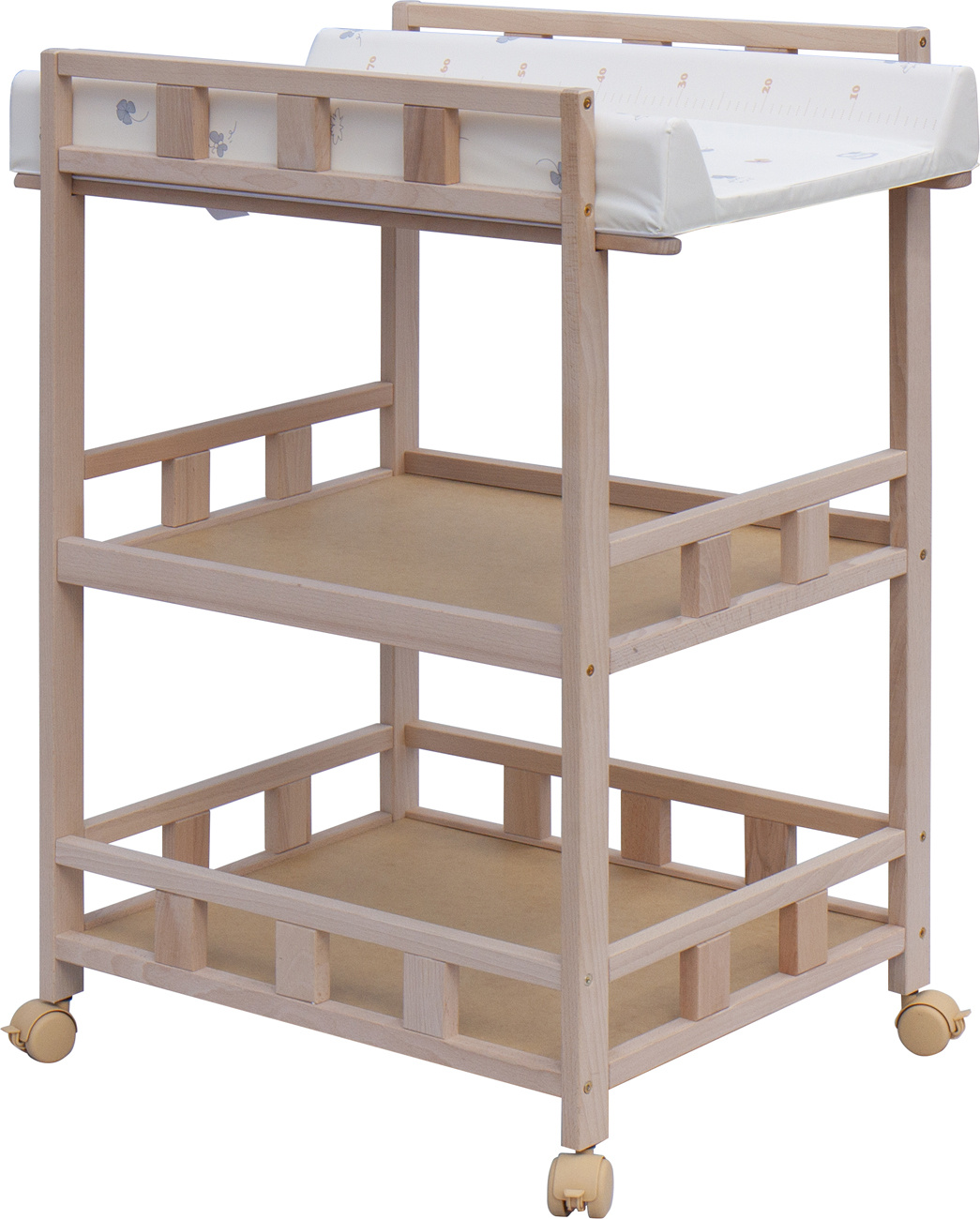 Praktický přebalovací pult se dvěmi policemi z HDF desky. Vrchní přebalovací pult z polyuretanu potažený omyvatelným PVC, vyztužený MDF deskou.