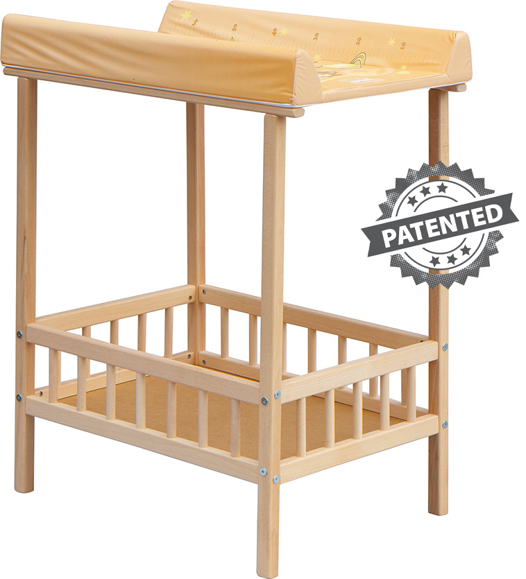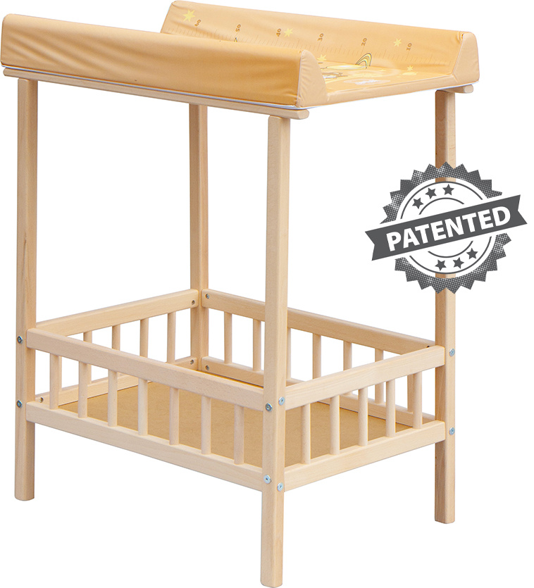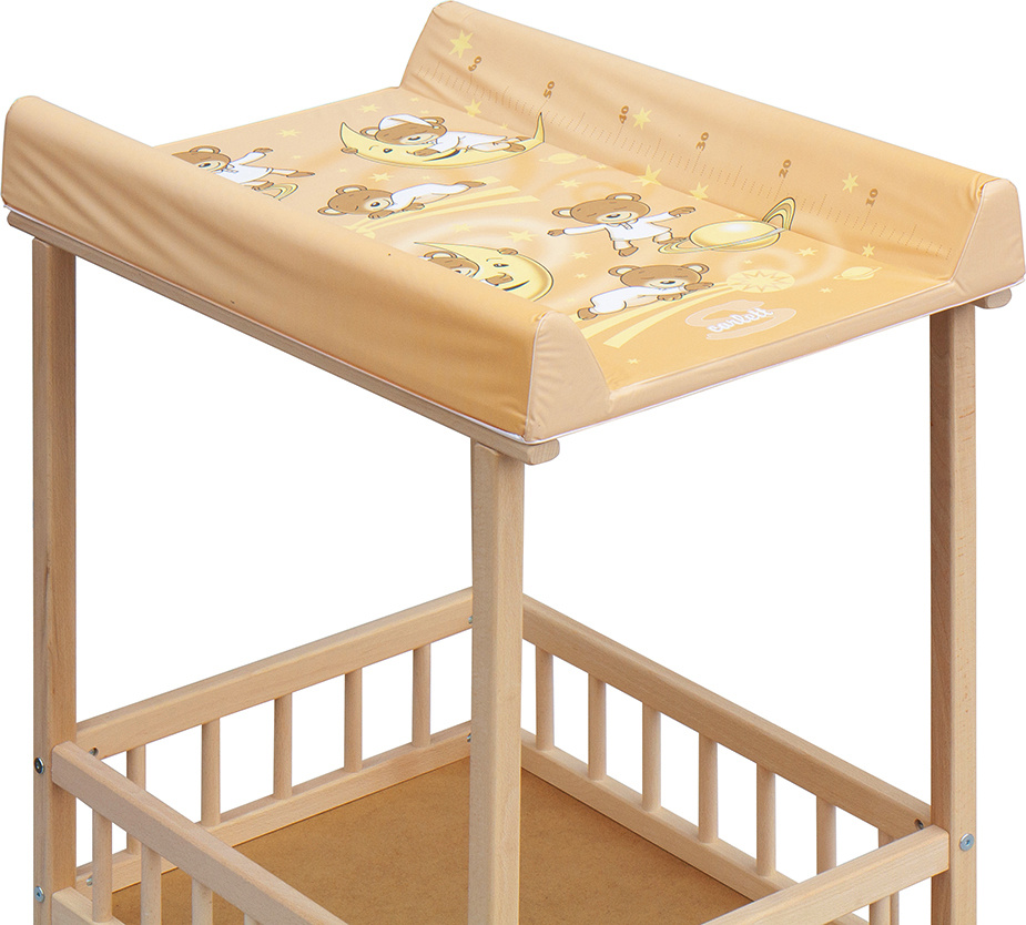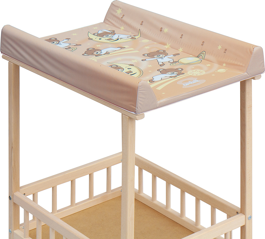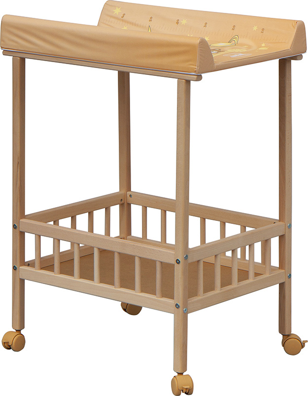 Praktický přebalovací pult se dvěmi policemi z HDF desky. Vrchní přebalovací pult z polyuretanu potažený omyvatelným PVC, vyztužený MDF deskou.