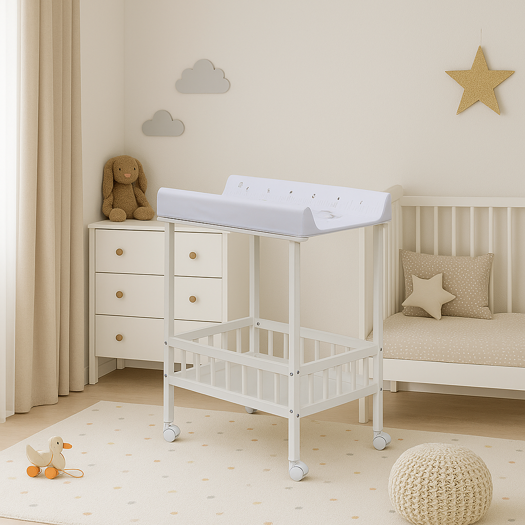 Praktický přebalovací pult se dvěmi policemi z HDF desky. Vrchní přebalovací pult z polyuretanu potažený omyvatelným PVC, vyztužený MDF deskou.