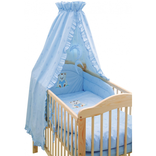 Souprava obsahuje: povlečení na peřinku 100 x 135 cm, povlečení na polštář 60 x 40 cm, mantinel do postýlky (okolo 2/3 postýlky) a nebesa. Tato souprava je vhodná i do postýlek 140 x 70cm.