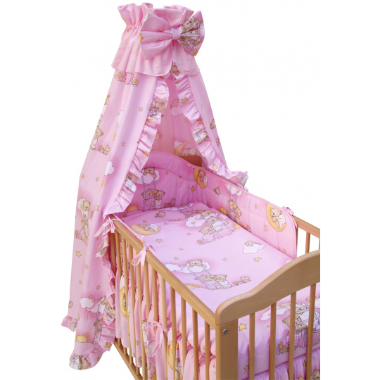 Souprava obsahuje: povlečení na peřinku 90 x 120 cm, povlečení na polštář 60 x 40 cm,mantinel do postýlky (okolo 2/3 postýlky) a nebesa. Tato souprava je vhodná i do postýlek 140 x 70cm.