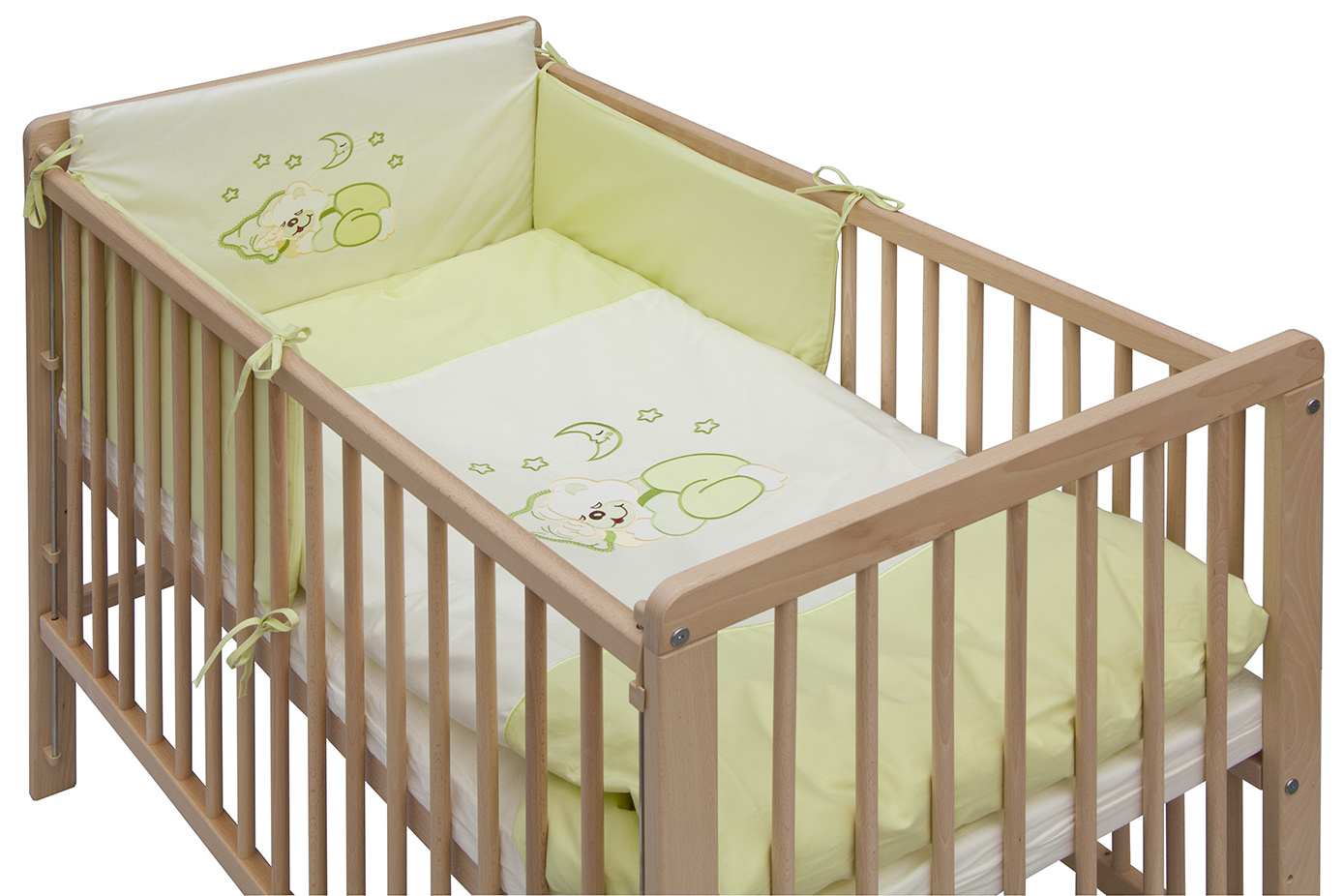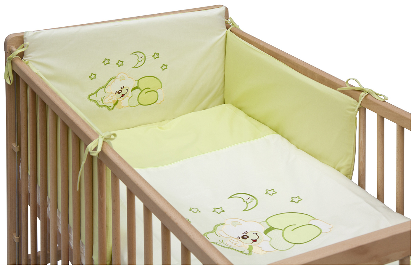 Mantinel do postýlky je okolo poloviny postýlky (do potahu mantinelu je všitý zip, potah mantinelu se pere samostatně). K uchycení slouží tkaničky v každém rohu.Povlečení je vyrobeno ze 100% bavlny. Výplň-polyester-duté vlákno.