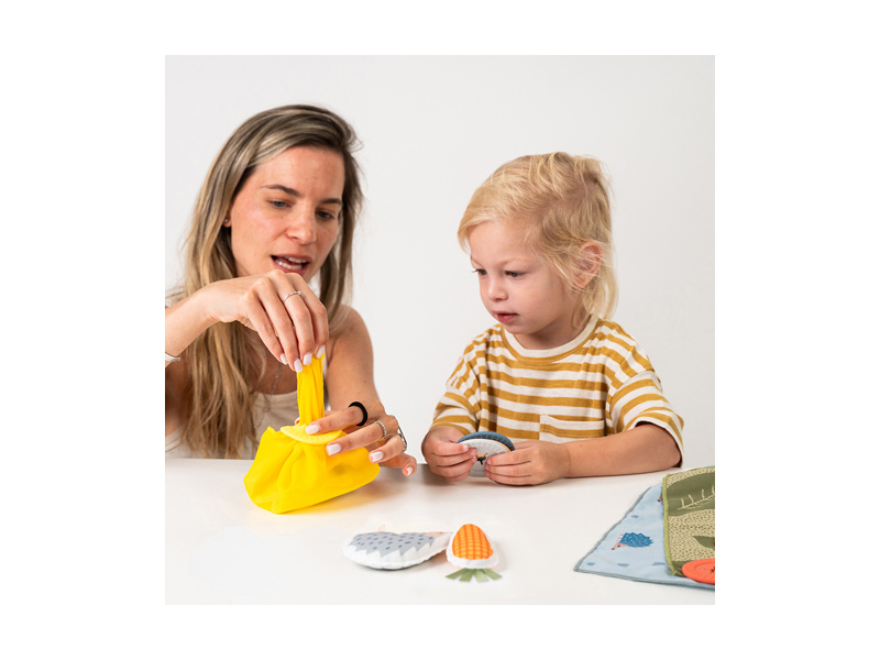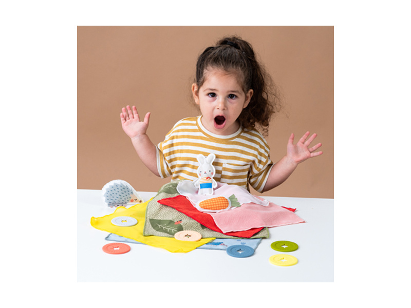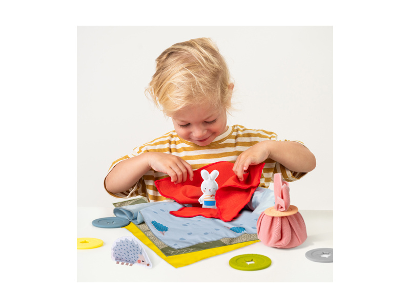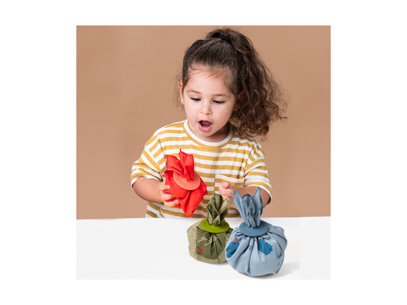 Poutavá schovávací hra pro vaše batole obsahuje 6 šátků, 6 silikonových uzávěrů a 3 hračky v podobě zajíčka, ježka a mrkvičky. Hračku zabalíte do šátků, uzavřete uzávěrem a dítě postupným rozbalováním jednotlivých vrstev hledá, co se uvnitř skrývá. Hračka zábavnou formou rozvíjí jemnou motoriku, představivost a kreativitu dítěte, učí jej barvám i vztahu příčina / následek. Zároveň ji můžete využít i pro učení dítěte barvám i prvnímu počítání. Svým provedením je hra skvělá na hraní doma i na cestách. Vhodné pro děti od 18 měsíců.